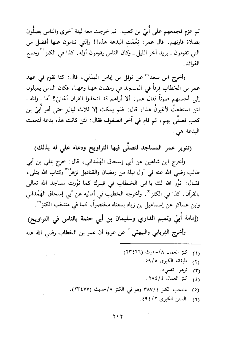 وأخرج ابن شاهين عن أبي إسحاق الهَمْداني قال: خرج علي بن أبي طالب رضي الله عنه في أول ليلة من رمضان والقناديل تزدهر وكتاب الله يتلى، فقال: نوَّر الله لك يا ابن الخطاب في قبرك كما نوَّرت مساجد الله تعالى بالقرآت. كذا في الكنز. وأخرج الخطيب في أماليه عن أبي إسحاق الهَمْداني وابن عساكر عن إسماعيل بنزياد بمعناه مختصراً. كما في منتخب الكنر.