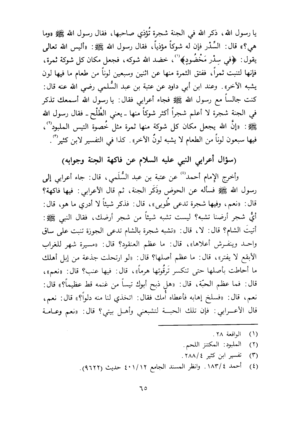 وأخرج الإِمام أحمد عن عتبة بن عبد السلمي قال: جاء أعرابي إلى رسول الله صلى الله عليه وسلم فسأله عن الحوض وذَكَر الجنة، ثم قال الأعرابي: فيها فاكهة؟ قال: «نعم، وفيها شجرة تدعى طُوبى» ، قال: فذكر شيئاً لا أدري ما هو، قال: أيُّ شجر أرضنا تشبه؟ قال: ليست تشبه شيئاً من شجر أرضك، فقال النبي صلى الله عليه وسلم أتيتَ الشام؟ قال: لا، قال: «تشبه شجرة بالشام تدعى الجوزة تنبت على ساق واحد وينفرش أعلاها» ، قال: ما عظم العنقود؟ قال: «مسيرة شهر للغراب الأبقع لا يفتر» ، قال: ما عظم أصلها؟ قال: «لو ارتحلت جذعةً من إبل أهلك ما أحاطت بأصلها حتى تنكر تَرقُوتها هرماً» ، قال: فيها عنب؟ قال: «نعم» ، قال: فما عظم الحبّة، قال: هل ذبح أبوك تيساً من غنمه قط عظيماً» ؟ قال: نعم، قال: «فسلخ إهابه فأعطاه أُمك فقال: اتخذي لنا منه دلواً» ؟ قال: نعم، قال اوعرابي؛ فإن تلك الحبة لتشبعني وأهل بيتي؟ قال: «نعم وعامة