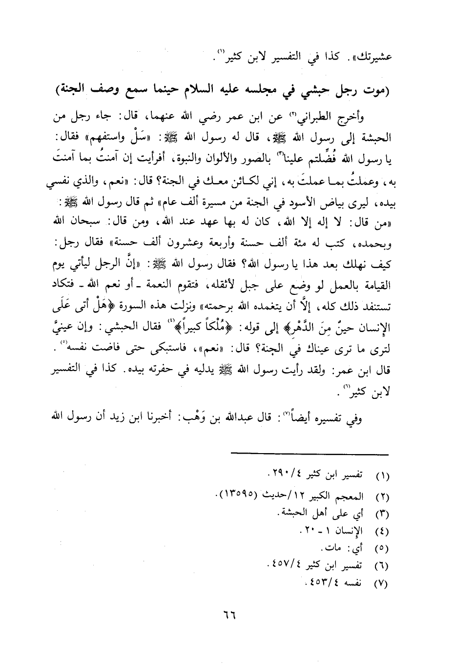 وأخرج الطبراني عن ابن عمر رضي الله عنهم قال: جاء رجل من الحبشة إلى رسول الله صلى الله عليه وسلم قال له رسول الله صلى الله عليه وسلم «سل واستفهم» فقال: يا رسول الله فُضِّلتم علينا بالصور والألوان والنبوة، أفرأيت إن آمنتَ بما آمنتَ به، وعلمتَ بما عملت به، إني لكائن معك في الجنة؟ قال: «نعم، والذي نفسي بيده، إنه ليرى بياض الأسود في الجنة من مسيرة ألف عام» ثم قال رسول الله صلى الله عليه وسلم «من قال: لا إله إلا الله، كان له بها عهد عند الله، ومن قال: سبحان الله وبحمده، كتب له مائة ألف حسنة وأربعة وعشرون ألف حسنة» ، فقال رجل: كيف نهلك بعد هذا يا رسول الله؟ فقال رسول الله صلى الله عليه وسلم «إنَّ الرجل ليأتي يوم لقيامة بالعمل لو وضع على جبل لأثقله، فتقوم النعمة - أبو نعم الله - فتكاد تستنفد ذلك كله، إلاّ أن يتغمده الله برحمته» ونزلت هذه السورة {هَلْ أَتَى عَلَى الإِنسَانِ حِينٌ مّنَ الدَّهْرِ} (سورة الإنسان، الآيتان: 1 و20) فقال الحبشي: وإن عينيَّ لترى ما ترى عيناك في الجنة؟ قال: «نعم» ، فاستبكى حتى فاضت نفسه. قال ابن عمر: ولقد رأيت رسول الله صلى الله عليه وسلم يدليه في حفرته بيده. كذا في التفسير لابن كثير. وفي تفسيره أيضاً: قال عبد الله بن وَهْب: أخبرنا ابن زيد أن رسول الله