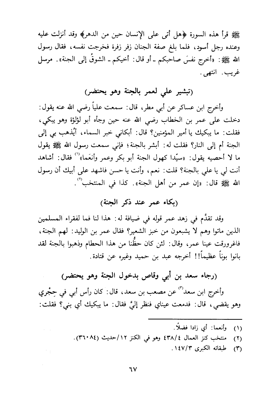صلى الله عليه وسلم قرأ هذه السورة {هَلْ أَتَى عَلَى الإِنسَانِ حِينٌ مّنَ الدَّهْرِ} وقد أنزلت عليه وعنده رجل أسود، فلما بلغ صفة الجنان زفر زفرة فخرجت نفسه، فقال رسول الله صلى الله عليه وسلم «أخرج نفس صاحبكم - أو قال: أخيكم - الشوق إلى الجنة» . مرسل غريب. انتهى.