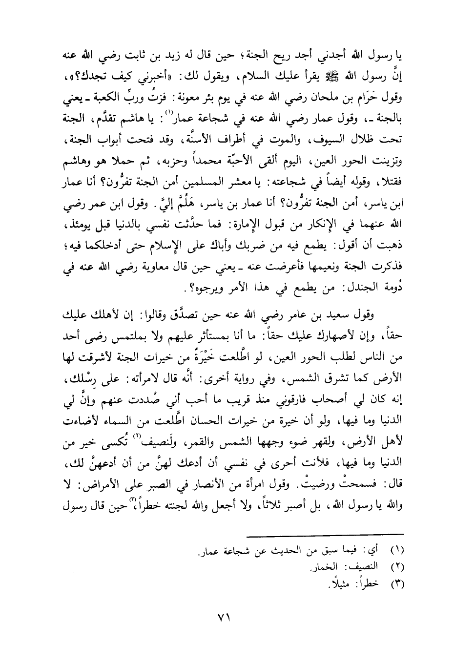 يا رسول الله أجدني أجد ريح الجنة؛ حين قال له زيد بن ثبت رضي الله عنه إنَّ رسول الله صلى الله عليه وسلم يقرأ عليك السلام، ويقول لك: «أخبرني كيف تجدك» ؟، وقول حَرَام بن ملحان رضي الله عنه في شجاعة عمار: يا هاشم تقدَّم، الجنة تحت ظلال السيوف، والموت في أطراف الأسنَّة، وقد فتحت أبواب الجنة، وتزينت الحور العين، اليوم ألقى الأحبّة محمداً وحزبه، ثم حملا هو وهاشم فقتلا، وقوله أيضاً في شجاعته: يا معشر المسلمين أمن الجنة تفرُّون؟ أنا عمار بن ياسر، أمن الجنة تفرُّون؟ أنا عمار بنياسر، هَلُمَّ إليَّ. وقول ابن عمر رضي الله عنهما في الإِنكار من قبول الإِمارة: فما حدَّثت نفسي بالدنيا قبل يومئذ، ذهبت أن أقول: يطمع فيه من ضربك وأباك على الإِسلام حتى أدخلكما فيه؛ فذكرت الجنة ونعيمها فأعرضت عنه - يعني حين قال معاوية رضي الله عنه في دُومة الجندل: من يطمع في هذا الأمر ويرجوه؟.