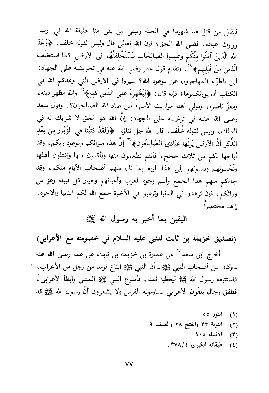 اليقين بما أخبر به رسول الله صلى الله عليه وسلم تصديق خزيمة بن ثابت للنبي عليه السلام في خصومته مع الأعرابي