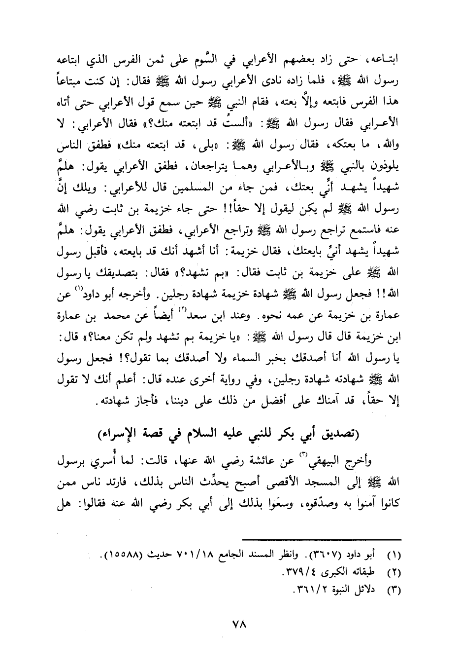 ابتاعه، حتى زاد بعضهم الأعرابي في السَّوم على ثمن الفرس الذي ابتاعه رسول الله صلى الله عليه وسلم فلما زاده نادى الأعرابي رسول الله صلى الله عليه وسلم فقال: إن كنت مبتاعاً هذا الفرس فابتعه وإلاَّ بعته، فقام النبي صلى الله عليه وسلم حين سمع قول الأعرابي حتى أتاه الأعرابي فقال رسول الله صلى الله عليه وسلم «ألستُ قد ابتعته منك» ؟ فقال الأعرابي: لا والله، ما بعتكه، فقال رسول الله صلى الله عليه وسلم «بلى، قد ابتعته منك» فطفق الناس يلوذون بالنبي صلى الله عليه وسلم وبالأعرابي وهما يتراجعان، فطفق الأعرابي يقول: هلمَّ شهيداً يشهد أنِّي بعتك، فمن جاء من المسلمين قال للأعرابي: ويلك أنَّ رسول الله صلى الله عليه وسلم لم يكن ليقول إلاَّ حقاً حتى جاء خزيمة بن ثابت رضي الله عنه فاستمع تراجع رسول الله صلى الله عليه وسلم وتراجع الأعرابي، فطفق الأعرابي يقول: هلمَّ شهيداً يشهد أنِّي بايعتك، فقال خزيمة، أنا أشهد أنك قد بايعته، فأقبل رسول الله صلى الله عليه وسلم على خزيمة بن ثابت فقال: بم تشهد» ؟ فقال: بتصديقك يا رسول الله فجعل رسول الله صلى الله عليه وسلم شهادة خزيمة شهادة رجلين. وأخرجه أبو داود عن عمارة بن خزيمة عن عمه نحون. وعند ابن سعد أيضاً عن محمد بن عمارة بن خزيمة قال رسول الله صلى الله عليه وسلم «يا خزيمة بم بتشهد ولم تكن معنا» ؟ قال: يا رسول الله أنا أصدقك بخبر السماء ولا أصدقك بما تقول؟ فجعل رسول الله صلى الله عليه وسلم شهادته شهادة رجلين،