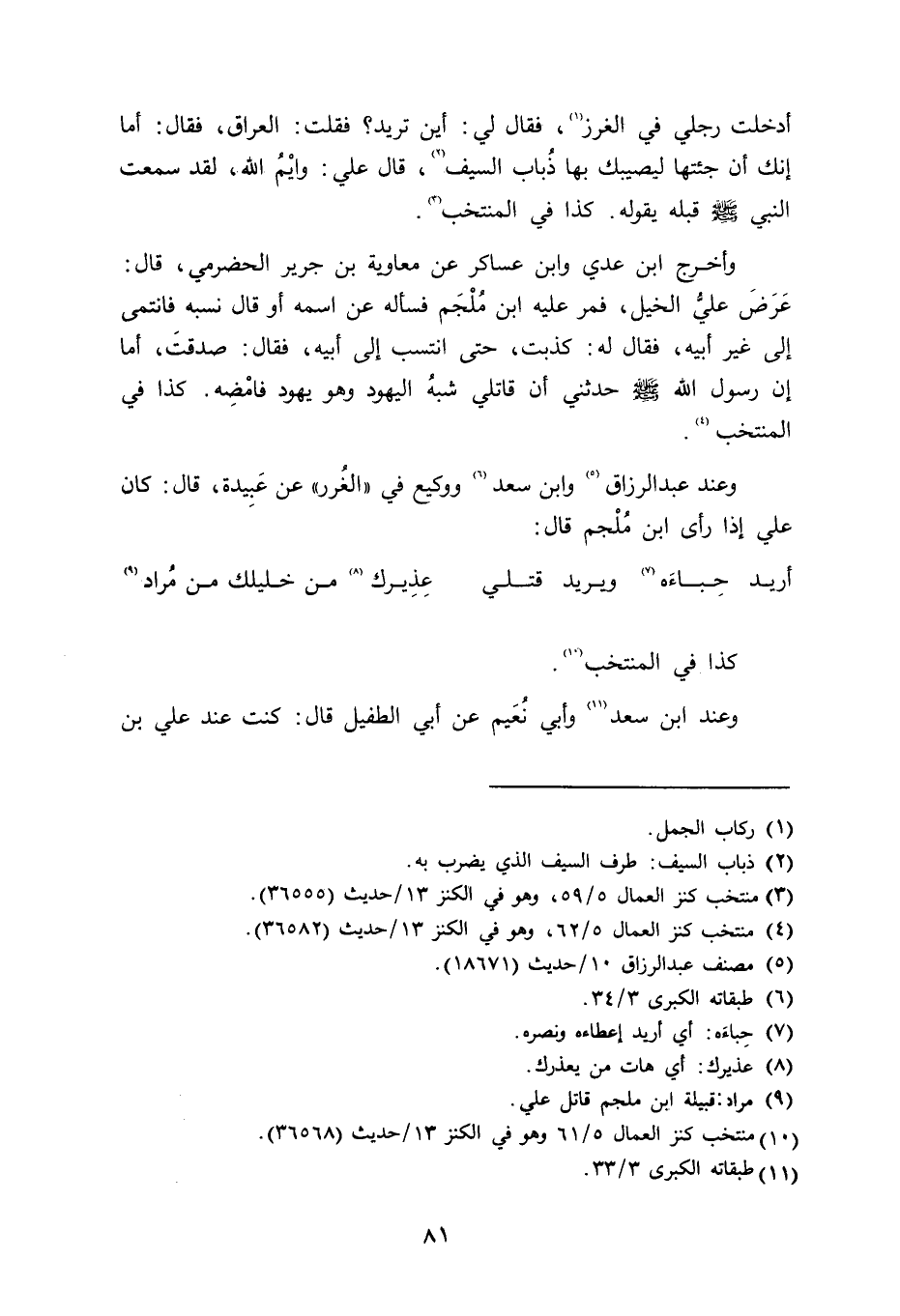 أدخلت رجلي في الغرز فقال لي: أين تريد؟ فقلت: العراق، فقال: أما إنك إن جئتها ليصيبك بها ذُباب السيف، قال علي: وايْمُ الله، لقد سمعت النبي صلى الله عليه وسلم قبله يقوله. كذا في المنتخب.