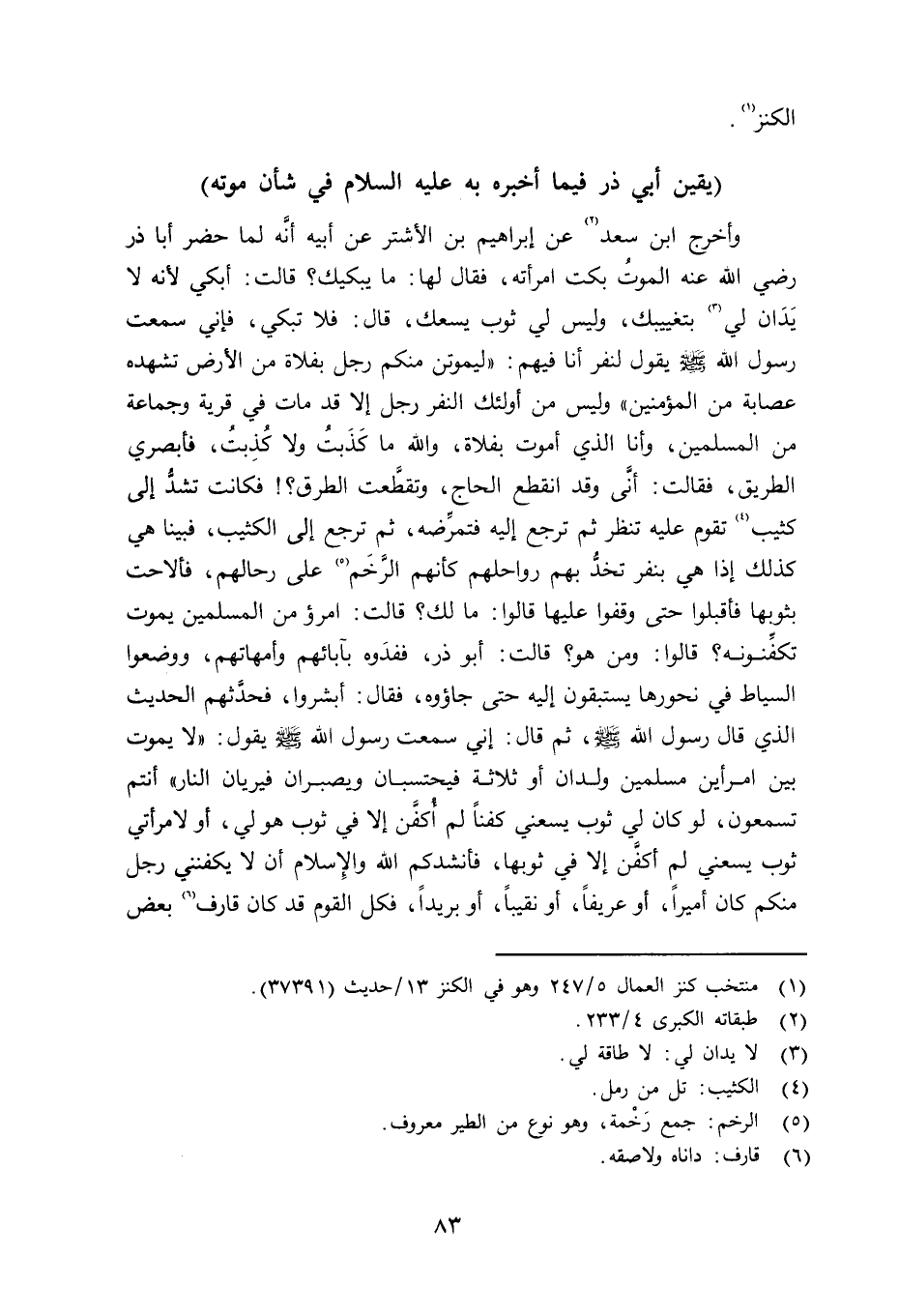 وأخرج ابن سعد عن إبراهيم بن الأشتر عن أبيه أنَّه لما حضر أبا ذر رضي الله عنه الموتُ بكت امرأته، فقال لها: ما يبكيك؟ قالت: أبكي لأنه لا يَدَان لي بتغيبك، وليس لي ثوب يسعك، قال: فلا تبكي، فإني سمعت رسول الله صلى الله عليه وسلم يقول لنفر أنا فيهم «ـ «ليموتن منكم رجل بفلاة من الأرض تسهده عصابة من المؤمنين» وليس من أولئك النفر رجل إلاَّ قد مات في قرية وجماعة من المسلمين، وأنا الذي أموت بفلاة، والله ما كَذَبتُ ولا كُذِبتُ، فأبصري الطريق، فقالت: أنَّى وقد انقطع الحاج، وتقطَّعت الطرق؟ فكانت تشدُّ إلى كثيب تقوم عليه تنظر ثم ترجع إيه فتمرِّضه، ثم ترجع إلى الكثيب، فبينا هي كذلك إذا هي بنفر تخدُّ بهم رواحلهم كأنهم الرَخَم على رحالهم، فألاحت بثوبها فأقبلوا حتى وقفوا عليها وقالوا: ما لك؟ قالت: أمرؤ من المسلمين يموت تكفِّنونه؟ قالوا: ومن هَو؟ قال: أبو ذر، ففدَوه بآبائهم وأمهاتهم، ووضعوا السياط في نحورها يستبقون إليه حتى جاؤوه، فقال: أبشروا، فحدَّثهم الحديث الذي قال رسول الله صلى الله عليه وسلم ثم قال: إني سمعت رسول الله صلى الله عليه وسلم يقول: «لا يموت بين امرأين مسلمين ولدان أو ثلاثة فيحستبان ويصبران فيريان النار» أنتم تسمعون، لو كان لي ثوب يسعني كفناً لم أُكفَّن إلاَّ في ثوب هو لي، أو لامرأتي ثو يسعني لم أكفَّن إلاَّ في ثوبها، فأنشدكم الله والإِسلام أن لا يكفنني رجل منكم كان أميراً، أو عريفاً، أو نقيباً، أو بريداً، فكل القوم قد كان قارف بعض