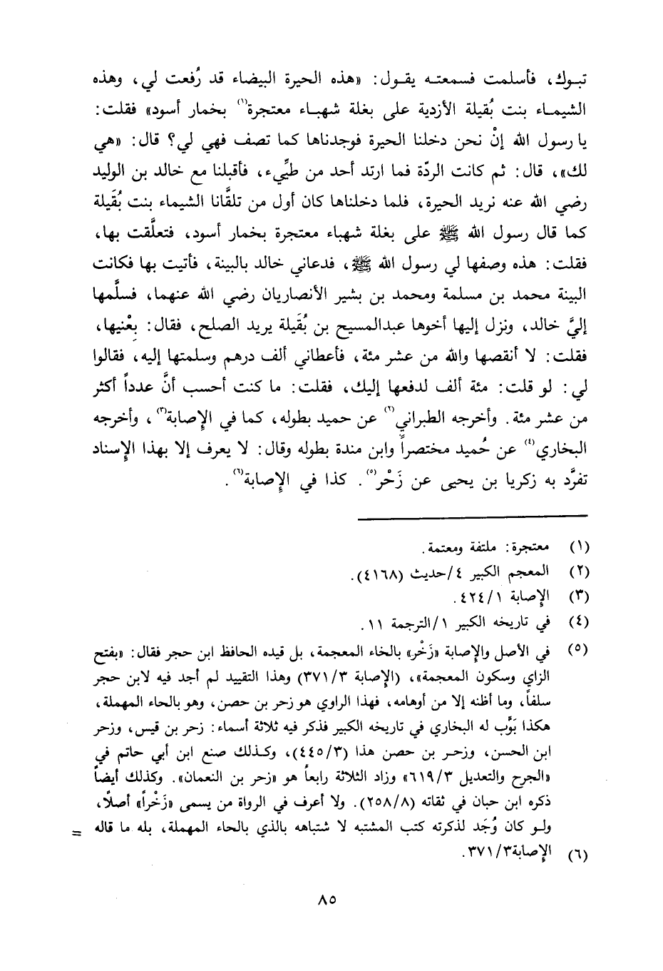 تبوك، فأسلمت فسمعته يقول: «هذه الحيرة البيضاء قد رُفعت لي، وهذه الشيماء بنت بُقيلة الأزدية على بغلة شهباء معتجرة بخمار أسود» فقلت: يا رسول الله إنْ نحن دخلنا الحيرة فوجدناها كما تصف فهي لي؟ قال: «هي لك» ، قال: ثم كانت الردّة فما ارتد أحد من طيِّىء، فأقبلنا مع خالد ابن الوليد رضي الله عنه نريد الحيرة، فلما دخلناها كان أول من تلقَّانا الشيماء بنت بُقَيلة كما قال رسول الله صلى الله عليه وسلم على بغلة شهباء معتجزة بخمار أسود، فتعلَّقت بها، فقلت: هذه وصفها لي رسول الله صلى الله عليه وسلم فدعاني خالد بالبينة، فأتيت بها فكانت البينة محمد بنمسلمة ومحمد بن بشير الأنصاريان رضي الله عنهما، فسلَّمها إليَّ خالد، ونزل إليها أخوها عبد المسيح بن بُقَيلة يريد الصلح، فقال: بِعْنيها، فقالت: لا أنقصها والله من عشر مائة، فأعطاني ألف درهم وسلم تها إليه، فقالوا لي: لو قلت: مائة ألف لدفعها إليك، فقلت: ما كنت أحسب أنَّ عدداً أكثر من عشر مائة. وأخرجه الطبراني عن حميد بطوله، كما في الإِصابة، وأخرجه البخاري عن حميد مختصراً وابن منده بطوله وقال: لا يعرف إلاَّ بهذا الإِسناد تفرَّد به زكريا بن يحيى عن زَحْر (بن حصين) . كذا في الإصابة.
