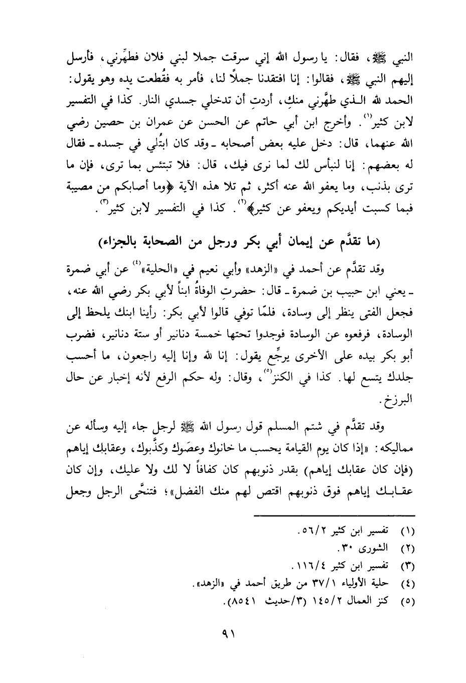 وقد تقدَّم عن أحمد في الزهد وأبي نعيم في الحلية عن أبي ضمرة - يعني ابن حبيب بن ضمرة - قال: حضرتِ الوفاةُ ابناً لأبي بكر رضي الله عنه، فجعل الفتى ينظر إلى وسادة، فلّما توفي قالوا لأبي بكر: رأينا ابنك يلحظ إلى الوسادة، فرفعوه عن الوسادة فوجدوا تحتها خمسة دنانير أو ستة دنانير، فضرب أبو بكر بيده على الأخرى يرجِّع يقول: إنا لله وإنا إليه راجعون، ما أحسب جلدك يتسع لها.. كذا في الكنز وقال: وله حكم الرفع لأنه إخبار عن حال البرزخ. وقد تقدَّم في شتم المسلم قول رسول الله صلى الله عليه وسلم لرجل جاء إليه وسأله عن مماليكه: «إذا كان يوم القيامة يحسب ما خانوك وعصَوك وكذَّبوك، وعقابك إياهم (فإن كان عقابك إياهم) بقدر ذنوبهم كان كفافاً لا لك ولا عليك، وإن كان عقابك إياهم فوق ذنوبهم اقتص لهم منك الفضل» ؛ فتنحَّى الرجل وجعل