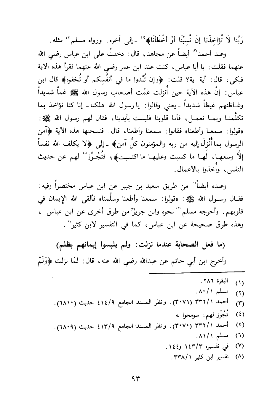 وعند أحمد أيضاً عن مجاهد قال: دخلت على ابن عباس رضي الله عنهما فقلت: يا أبا عباس، كنت عند ابن عمر رضي الله عنهما فقرأ هذه الآية فبكى، قال: أية آية؟ قلت: «وإن تبدوا ما في أنفسكم أو تخفوه» قال ابن عباس: إنَّ هذه الآية حين أنزلت غمّت أصحاب رسول الله صلى الله عليه وسلم غماً شديداً وغاظتهم غيظاً شديداً - يعني وقالوا: يا رسول الله هلكنا - إنا كنا نؤاخذ بما تكلَّمنا وبما نعمل، فأما قلوبنا فليست بأيدينا، فقال لهم رسول الله صلى الله عليه وسلم «قولوا: سمعنا وأطعنا» فقالوا: سمعنا وأطعنا، قال: فنسختها هذه الآية: {ءامَنَ الرَّسُولُ بِمَآ أُنزِلَ إِلَيْهِ مِن رَّبّهِ وَالْمُؤْمِنُونَ كُلٌّ ءامَنَ} - إلى {لاَ يُكَلّفُ اللَّهُ نَفْسًا إِلاَّ وُسْعَهَا} {لَهَا مَا كَسَبَتْ وَعَلَيْهَا مَا اكْتَسَبَتْ} ؛ فتُجُوِّز لهم عن حديث النفس وأُخذوا بالأعمال. وعنده أيضاً من طريق سعيد بن جبير عن ابن عباس مختصراً وفيه: فقال رسول الله صلى الله عليه وسلم «قولوا: سمعنا وأطعنا وسلَّمنا» فألقى الله الإِيمان في قلوبهم، وأخرجه مسلم نحوه وابن جرير من طرق أخرى عن ابن عباس، وهذه طرق صحيحة عن ابن عباس، كما في التفسير لابن كثير.