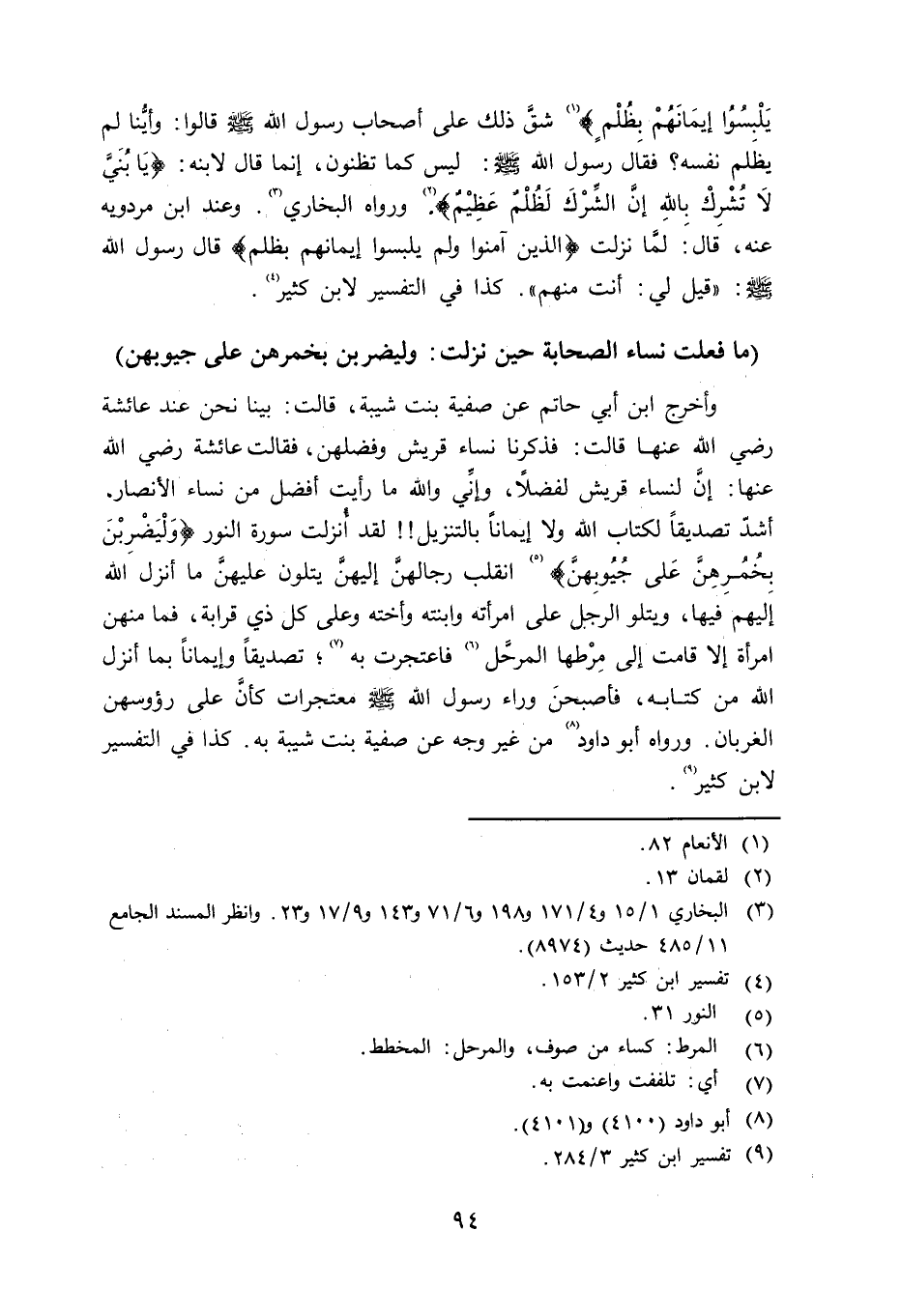وأخرج ابن أبي حاتم عن صفية بنت شيبة قالت: بينا نحن عند عائشة رضي الله عنها قال: فذكرنا نساء قريش وفضلهنَّ، فقالت عائشة رضي الله عنها: إنَّ لنساء قريش لفضلاً، وإنِّي والله ما رأيت أفضل من نساء الأنصار، أشدّ تصديقاً لكتاب الله ولا إيماناً بالتنزيل لقد أُنزلت سورة النور {وَلْيَضْرِبْنَ بِخُمُرِهِنَّ عَلَى جُيُوبِهِنَّ} (سورة النور، الآية: 31) انقلب رجالهنَّ إليهنَّ يتلون عليهنَّ ما أنزل الله إليهم فيها، ويتلو الرجل على امرأته وابنته وأخته وعلى كل ذي قرابة، فما منهن امرأة إلاَّ قامت إلى مِرْطها المرحَّل فاعتجرت به؛ تصديقاً وإيماناً بما أنزل الله من كتابه، فأصبحنَ وراء رسول الله متعتجرات كأنَّ على رؤوسهن الغربان. ورواه أبو داود من غير وجه عن صفية بنت شيبة به. كذا في التفسير لابن كثير.