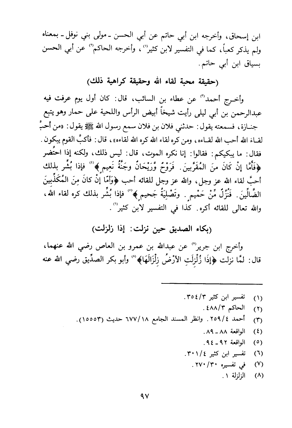 وأخرج أحمد عن عطاء بن السائب قال: كان أول يوم عرفت فيه عبد الرحمن بن أبي ليلى رأيت شيخاً أبيض الرأس واللحية على حمار وهو يتبع جنازة، فسمعته يقول: حدثني فلان بن فلان سمع رسول الله صلى الله عليه وسلم يقول: «من أحبَّ لقاء الله أحب الله لقاءه ومن كره لقاء الله كره الله لقاءه» ، قال: فأكبَّ القوم يبكون، فقال: ما يبكيكم: فقالوا: إنا نكره الموت، قال: ليس ذلك، ولكنه إذا احتُضر {فَأَمَّآ إِن كَانَ مِنَ الْمُقَرَّبِينَ} {فَرَوْحٌ وَرَيْحَانٌ وَجَنَّاتُ نَعِيمٍ} (سورة الواقعة، الآيتان: 88 و89) فإذا بُشِّر بذلك أحبَّ لقاء الله عز وجل، والله عز وجل للقائه أحب {وَأَمَّآ إِن كَانَ مِنَ الْمُكَذّبِينَ الضَّآلّينَ} {فَنُزُلٌ مّنْ حَمِيمٍ} {وَتَصْلِيَةُ جَحِيمٍ} (سورة الواقعة، الآيات: 92 - 94) فإذا بُشِّر بذلك كره لقاء الله، والله تعالى للقائه أكره. كذا في التفسير لابن كثير.