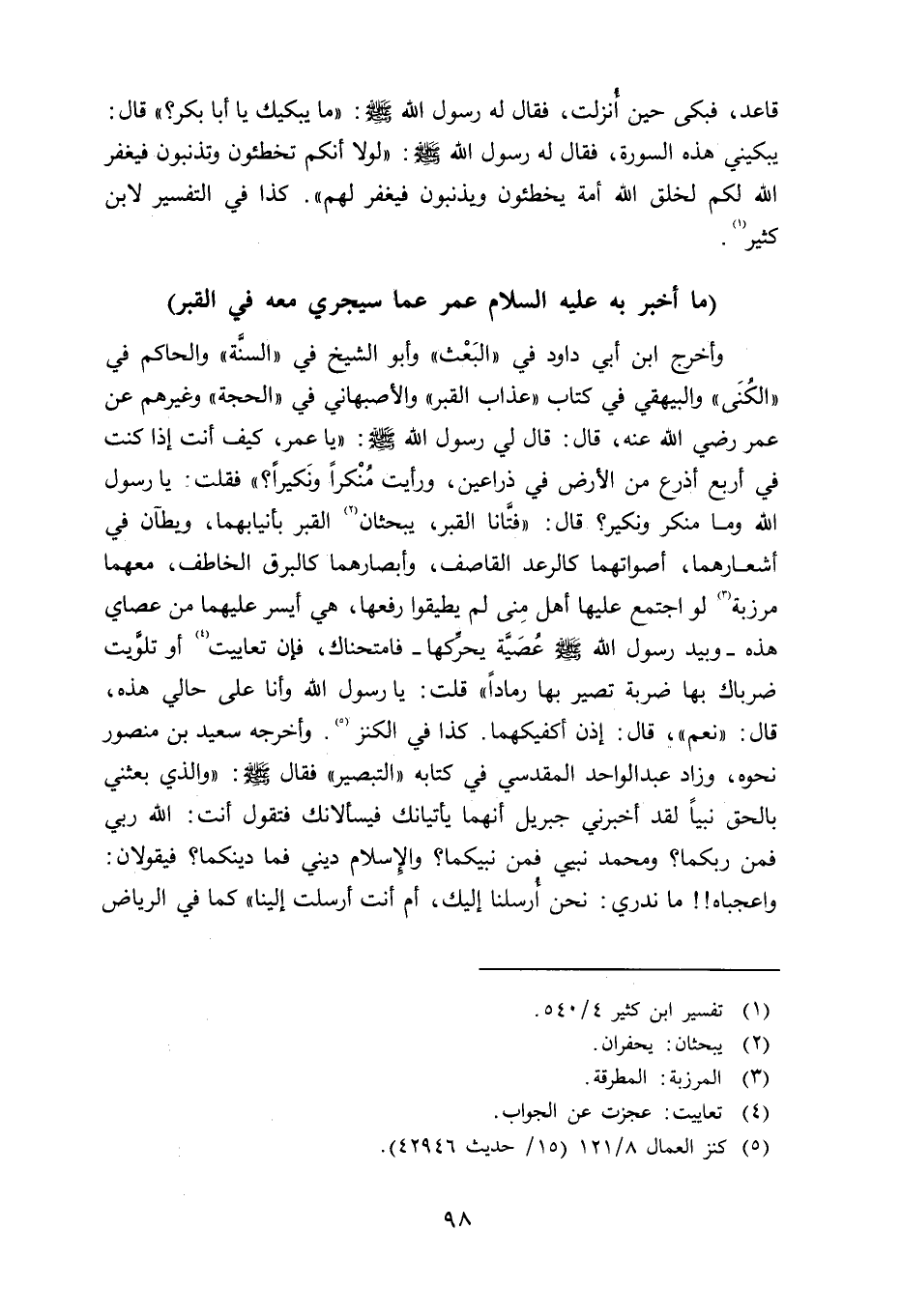 وأخرجه ابن أبي داود في البَعْث وأبو الشيخ في السنَّة والحاكم في الكُنَى والبيهقي في كتاب عذاب القبر والأصبهاني في الحجة وغيرهم عن عمر رضي الله عنه قال: قال لي رسول الله صلى الله عليه وسلم «يا عمر، كيف أنت إذا كنت في أربع أذرع من الأرض في ذراعين، ورأيت مُنْكراً ونَكيراً» ؟ فقلت: يا رسول الله وما منكر ونكير؟ قال: «فَتَّانا القبر، يبحثان القبر بأيابهما، ويطآن في أشعارهما، أصواتهما كالرعد القاصف، وأبصارهما كالبرق الخاطف، معهما مرزبة لو اجتمع عليها أهل مِنى لم يطيقوا رفعها، هي أيسر عليهما من عصاي هذه - وبيد رسول الله صلى الله عليه وسلم عُصَيَّة يحرِّكها - فامتحناك، فإن تعاييت أو تلوَّيت ضرباك بها ضربة تصير بها رماداً» قلت: يا رسول الله وأنا على حالي هذه، قال: «نعم» ، قال: إذن أكفيكهما ... كذا في الكنز. وأخرجه سعيد بن منصور نحوه، وزاد عبد الواحد المقدسي في كتابه التبصير فقال صلى الله عليه وسلم «والذي بعثني بالحق نبياً لقد أخبرني جبريل أنهما يأتيانك فيسألانك فتقول أنت: الله ربي فمن ربكما؟ ومحمد نبيي فمن نبيكما؟ والإِسلام ديني فما ينكما؟ فيقولان: وأعجباه ما ندري: نحن أُرسلنا إليك، أم أنت أرسلت إلينا» كما في الرياض