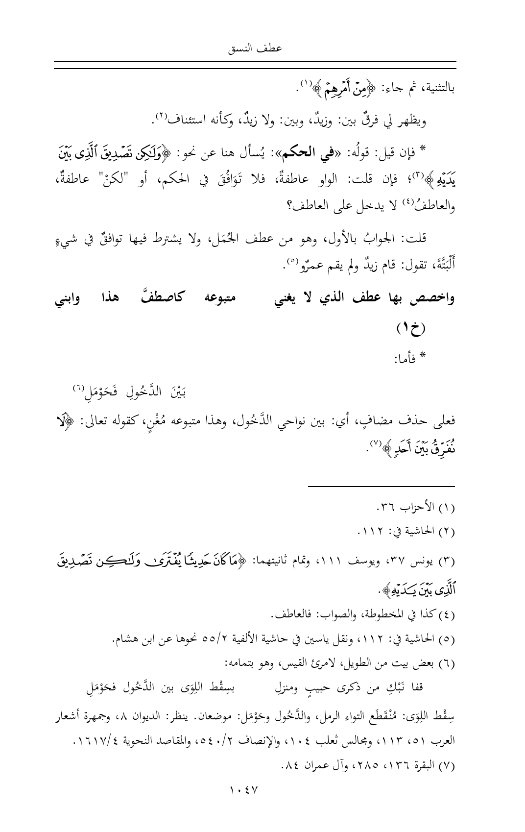 * فإن قيل: قولُه: «في الحكم»: يُسأل هنا عن نحو: {وَلَكِنْ تَصْدِيقَ الَّذِي بَيْنَ يَدَيْهِ} (¬٣)؛ فإن قلت: الواو عاطفةٌ، فلا تَوَافُقَ في الحكم، أو "لكنْ" عاطفةٌ، والعاطفُ (¬٤) لا يدخل على العاطف؟