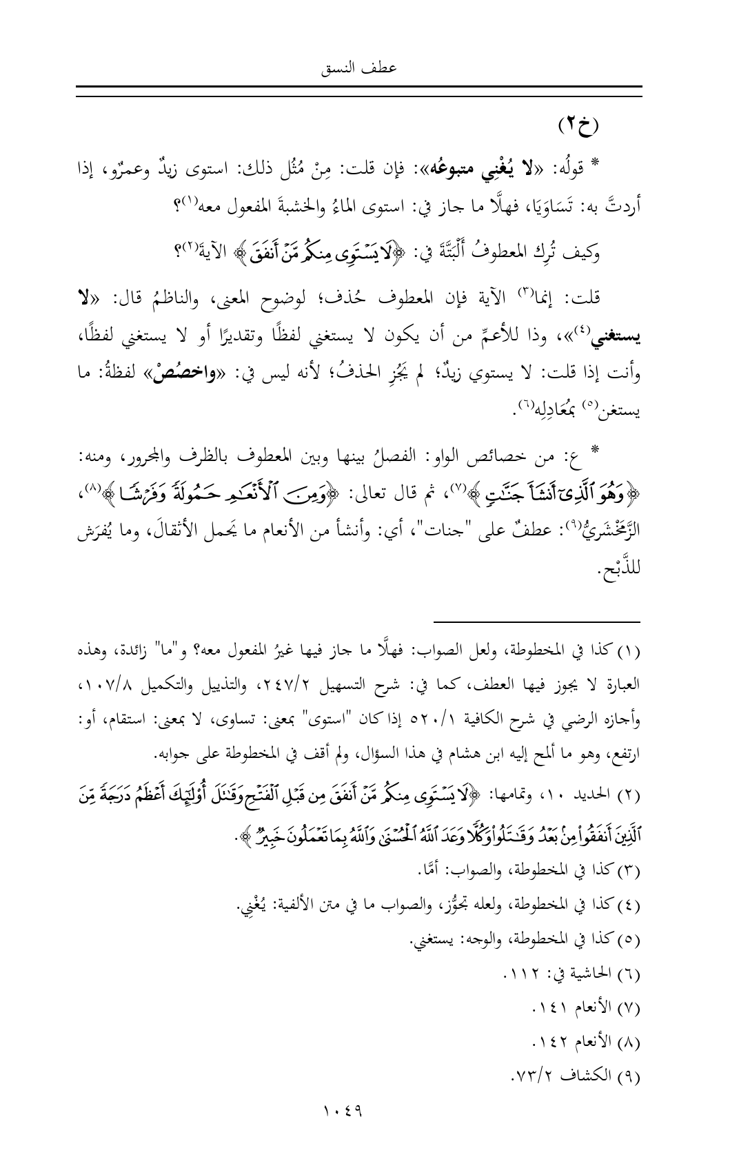 * قولُه: «لا يُغْنِي متبوعُه»: فإن قلت: مِنْ مُثُل ذلك: استوى زيدٌ وعمرٌو، إذا أردتَّ به: تَسَاوَيَا، فهلَّا ما جاز في: استوى الماءُ والخشبةَ المفعول معه (¬١)؟