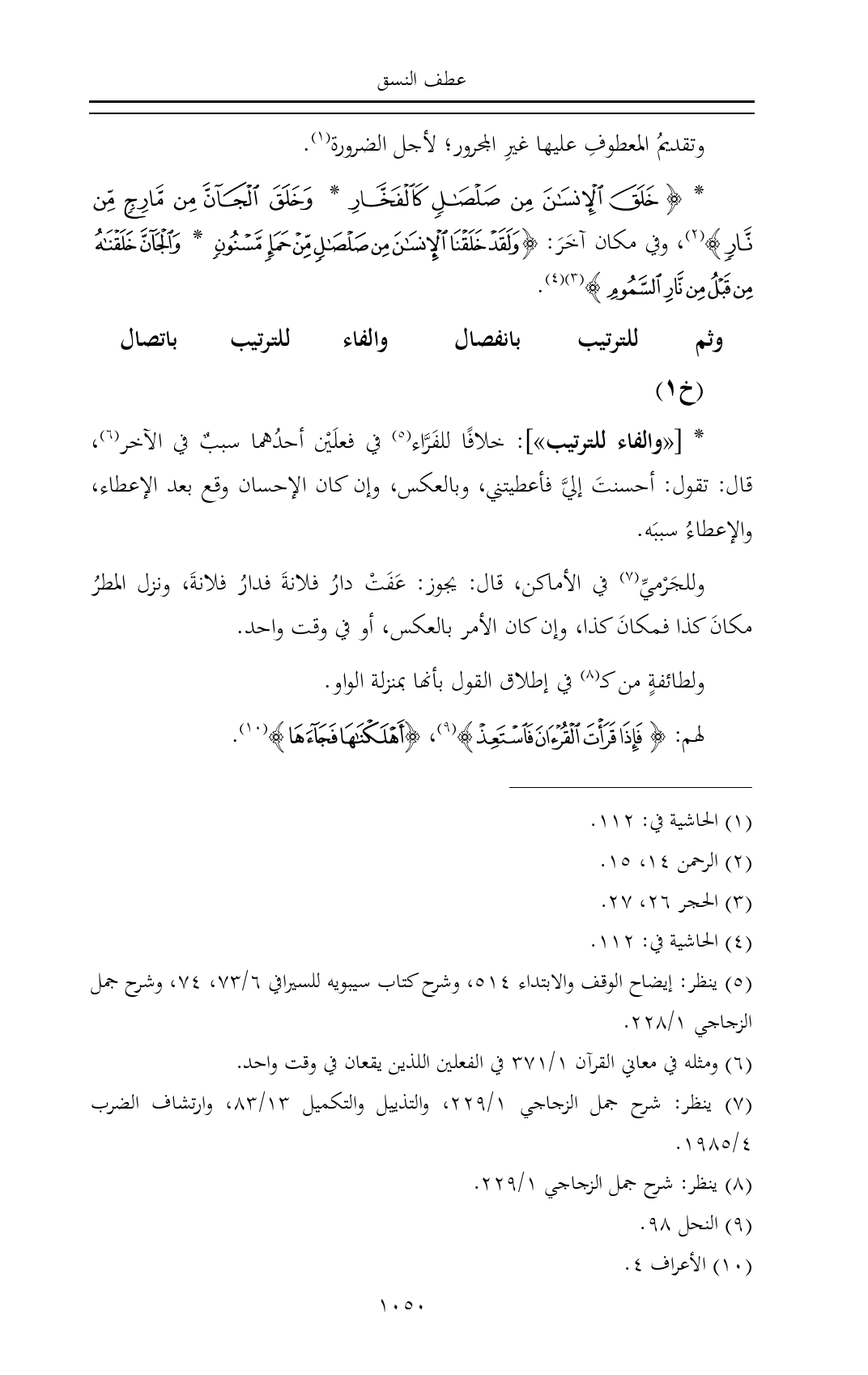 (¬٥) ينظر: إيضاح الوقف والابتداء ٥١٤، وشرح كتاب سيبويه للسيرافي ٦/ ٧٣، ٧٤، وشرح جمل الزجاجي ١/ ٢٢٨.