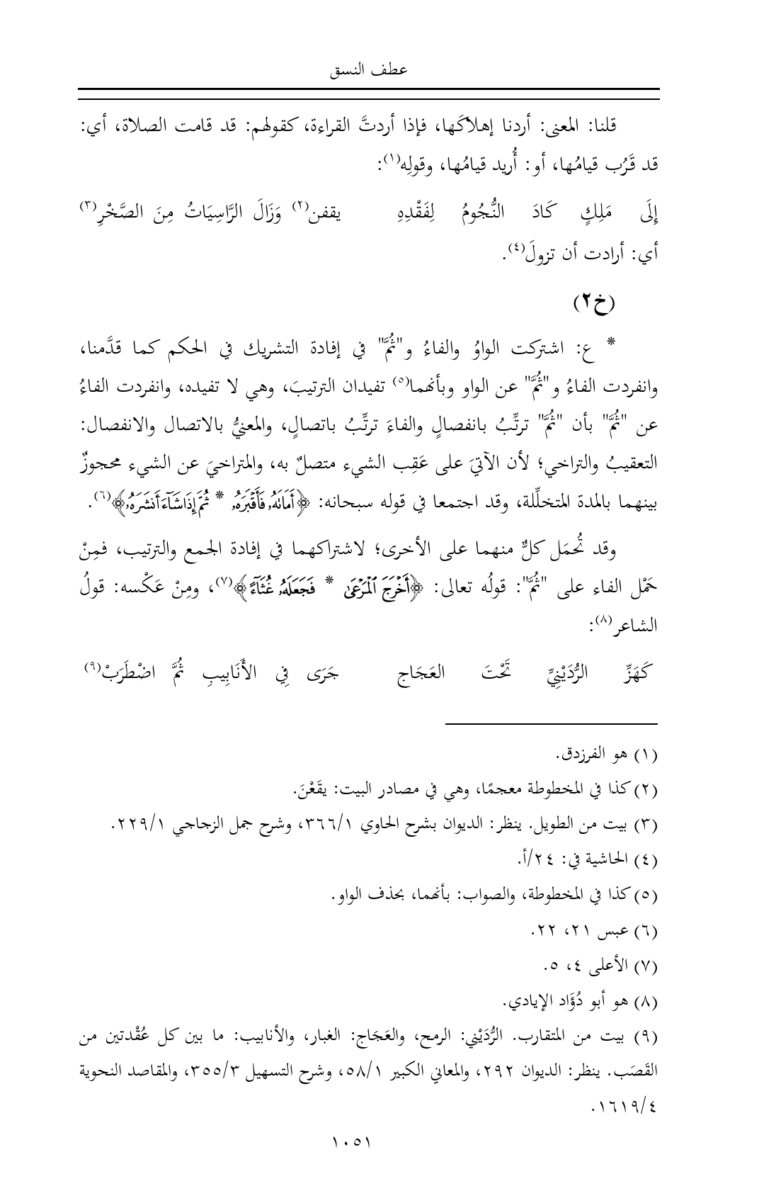 وقد تُحمَل كلٌّ منهما على الأخرى؛ لاشتراكهما في إفادة الجمع والترتيب، فمِنْ حَمْل الفاء على "ثُمَّ": قولُه تعالى: {أَخْرَجَ الْمَرْعَى * فَجَعَلَهُ غُثَاءً} (¬٧)، ومِنْ عَكْسه: قولُ الشاعر (¬٨):