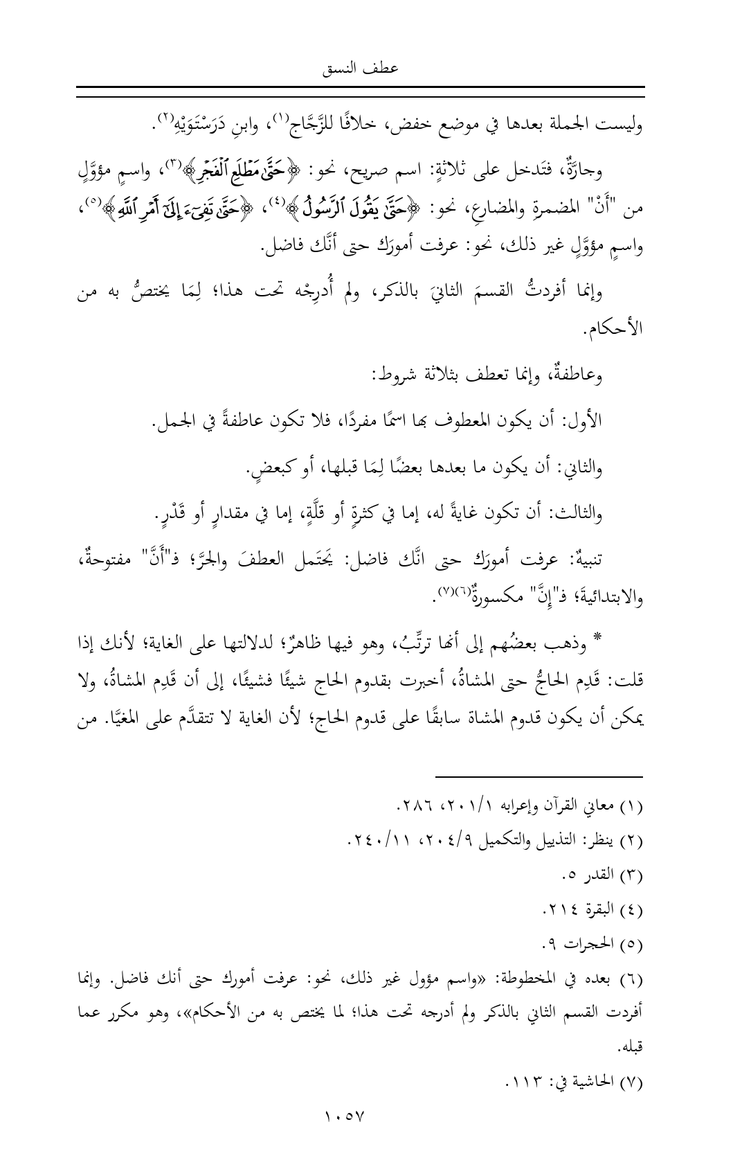 وجارَّةٌ، فتَدخل على ثلاثةٍ: اسم صريح، نحو: {حَتَّى مَطْلَعِ الْفَجْرِ} (¬٣)، واسمٍ مؤوَّلٍ من "أَنْ" المضمرةِ والمضارعِ، نحو: {حَتَّى يَقُولَ الرَّسُولُ} (¬٤)، {حَتَّى تَفِيءَ إِلَى أَمْرِ اللَّهِ} (¬٥)، واسمٍ مؤوَّلٍ غير ذلك، نحو: عرفت أمورَك حتى أنَّك فاضل.