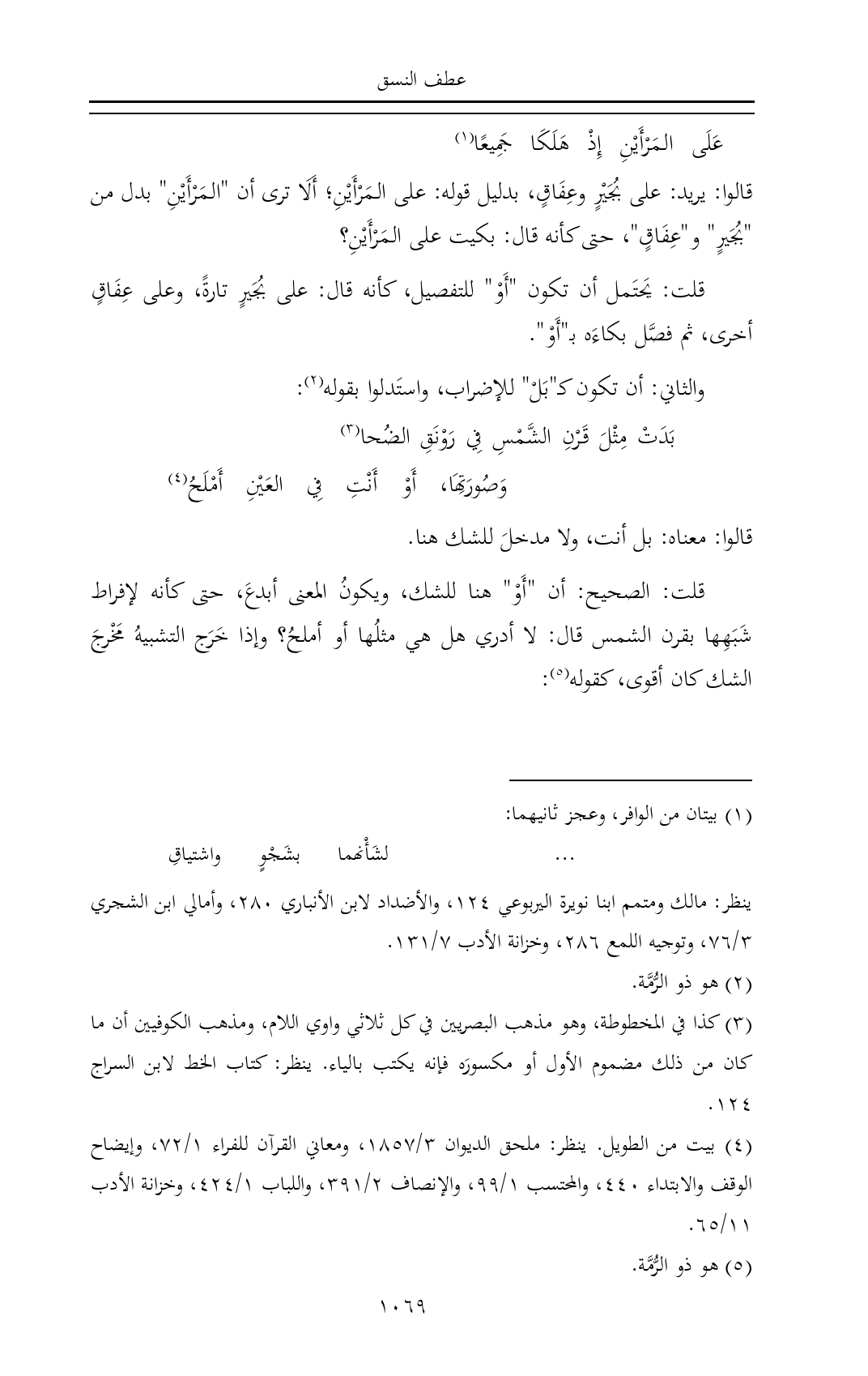 قالوا: يريد: على بُجَيْرٍ وعِفَاقٍ، بدليل قوله: على المَرْأَيْنِ؛ أَلَا ترى أن "المَرْأَيْنِ" بدل من "بُجَيرٍ" و"عِفَاقٍ"، حتى كأنه قال: بكيت على المَرْأَيْنِ؟