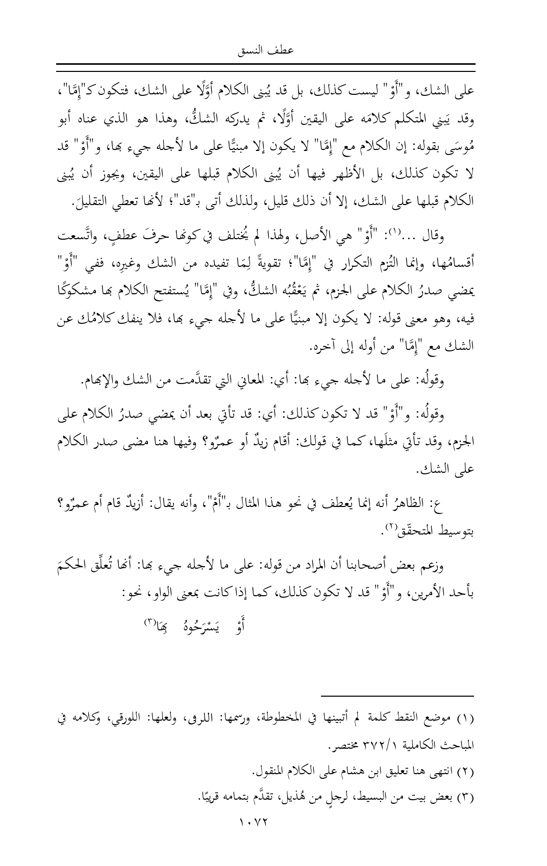 ع: الظاهرُ أنه إنما يُعطف في نحو هذا المثال بـ"أَمْ"، وأنه يقال: أزيدٌ قام أم عمرٌو؟ بتوسيط المتحقّق (¬٢).