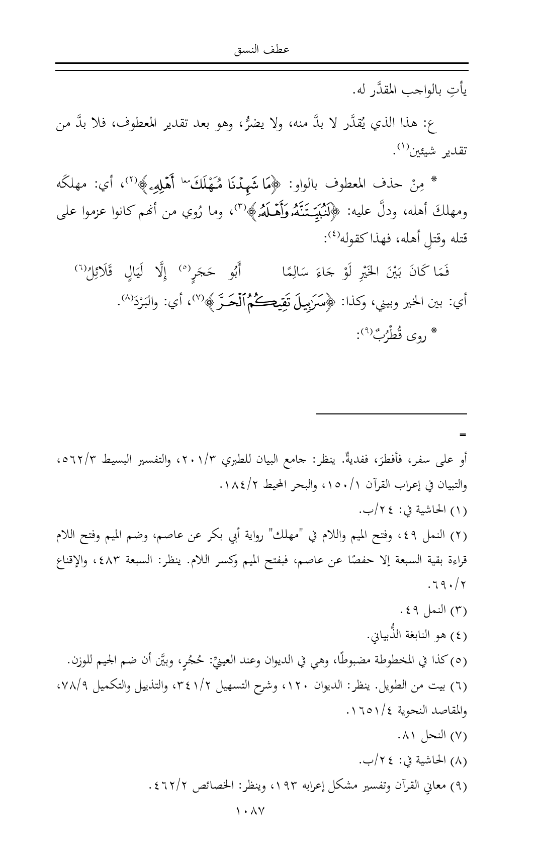 * مِنْ حذف المعطوف بالواو: {مَا شَهِدْنَا مَُهْلَكَ أَهْلِهِ} (¬٢)، أي: مهلكَه ومهلكَ أهله، ودلَّ عليه: {لَنُبَيِّتَنَّهُ وَأَهْلَهُ} (¬٣)، وما رُوي من أنهم كانوا عزموا على قتله وقتلِ أهله، فهذا كقوله (¬٤):