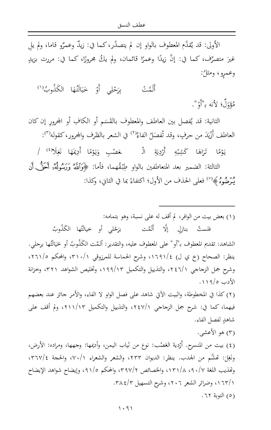 الأولى: قد يُقدَّم المعطوف بالواو إن لم يتصدَّر، كما في: زيدٌ وعمرٌو قاما، ولم يلِ غيرَ متصرِّف، كما في: إنَّ زيدًا وعمرًا قائمان، ولم يكُ مجرورًا، كما في: مررت بزيدٍ وعمرٍو، ومثلُ:
