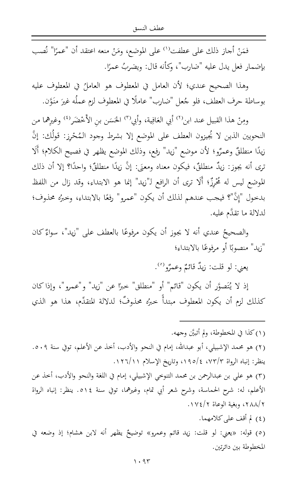 (¬٥) قوله: «يعني: لو قلت: زيد قائم وعمرو» توضيحٌ يظهر أنه لابن هشام؛ إذ وضعه في المخطوطة بين دائرتين.