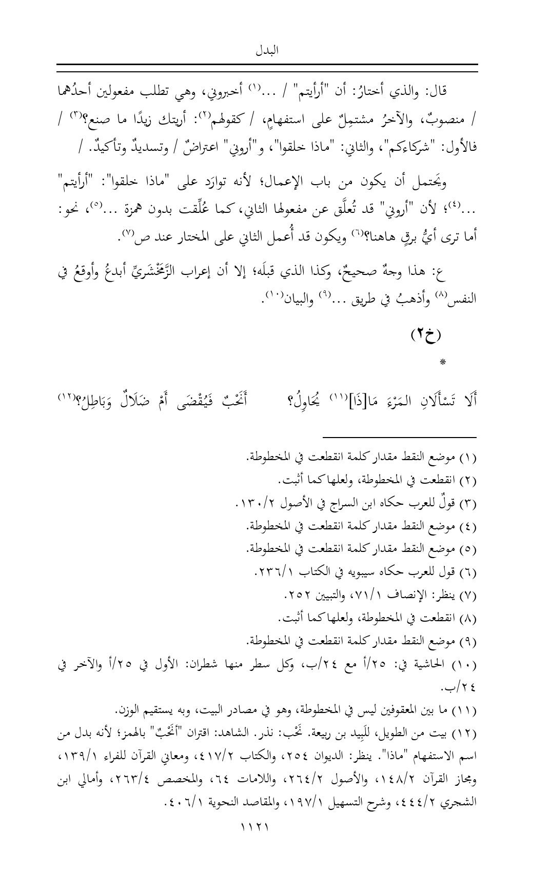 قال: والذي أختارُ: أن "أرأيتم" / ... (¬١) أخبروني، وهي تطلب مفعولين أحدُهما / منصوبٌ، والآخرُ مشتمِلٌ على استفهامٍ، / كقولهم (¬٢): أريتك زيدًا ما صنع؟ (¬٣) / فالأول: "شركاءكم"، والثاني: "ماذا خلقوا"، و"أروني" اعتراضٌ / وتسديدٌ وتأكيدٌ. /