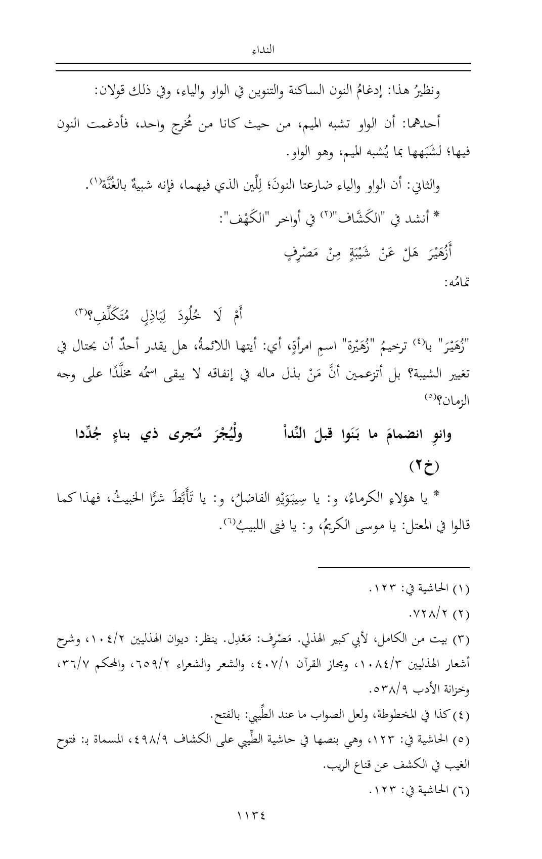 * يا هؤلاءِ الكرماءُ، و: يا سِيبَوَيْهِ الفاضلُ، و: يا تَأَبَّطَ شرًّا الخبيثُ، فهذا كما قالوا في المعتل: يا موسى الكريمُ، و: يا فتى اللبيبُ (¬٦).