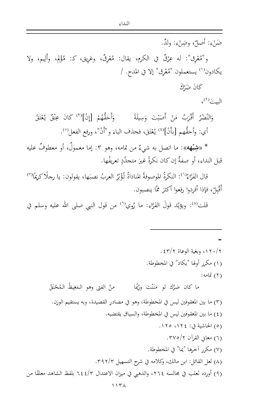 * «شِبْهه»: ما اتصل به شيءٌ من تمامه، وهو ٣: إما معمولٌ، أو معطوفٌ عليه قبل النداء، أو صفةٌ إن كان نكرةً غيرَ متجدِّدٍ تعريفُها.
