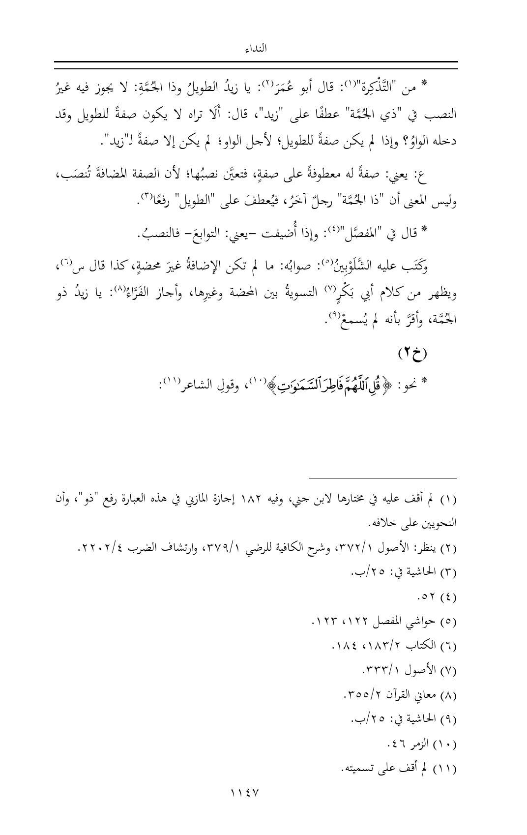* من "التَّذْكِرة" (¬١): قال أبو عُمَرَ (¬٢): يا زيدُ الطويلُ وذا الجُمَّةِ: لا يجوز فيه غيرُ النصب في "ذي الجُمَّة" عطفًا على "زيد"، قال: أَلَا تراه لا يكون صفةً للطويل وقد دخله الواوُ؟ وإذا لم يكن صفةً للطويل؛ لأجل الواو؛ لم يكن إلا صفةً لـ"زيد".