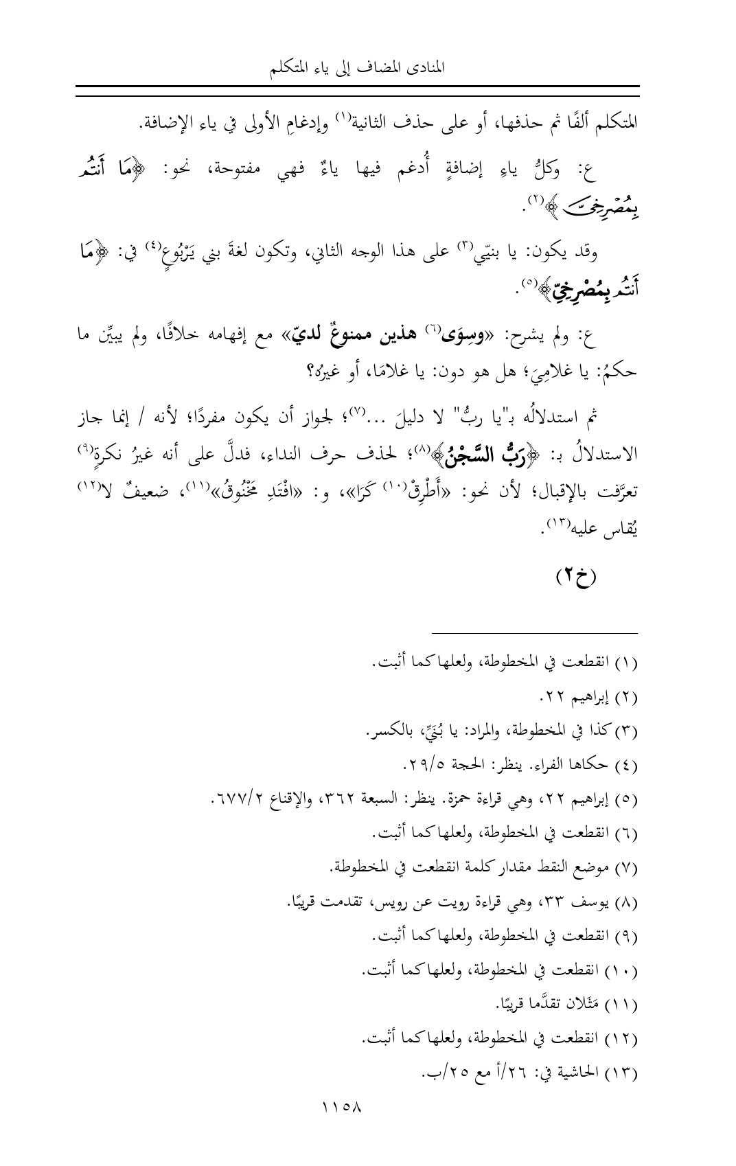 ع: وكلُّ ياءِ إضافةٍ أُدغم فيها ياءٌ فهي مفتوحة، نحو: {مَا أَنْتُمْ بِمُصْرِخِيَّ} (¬٢).