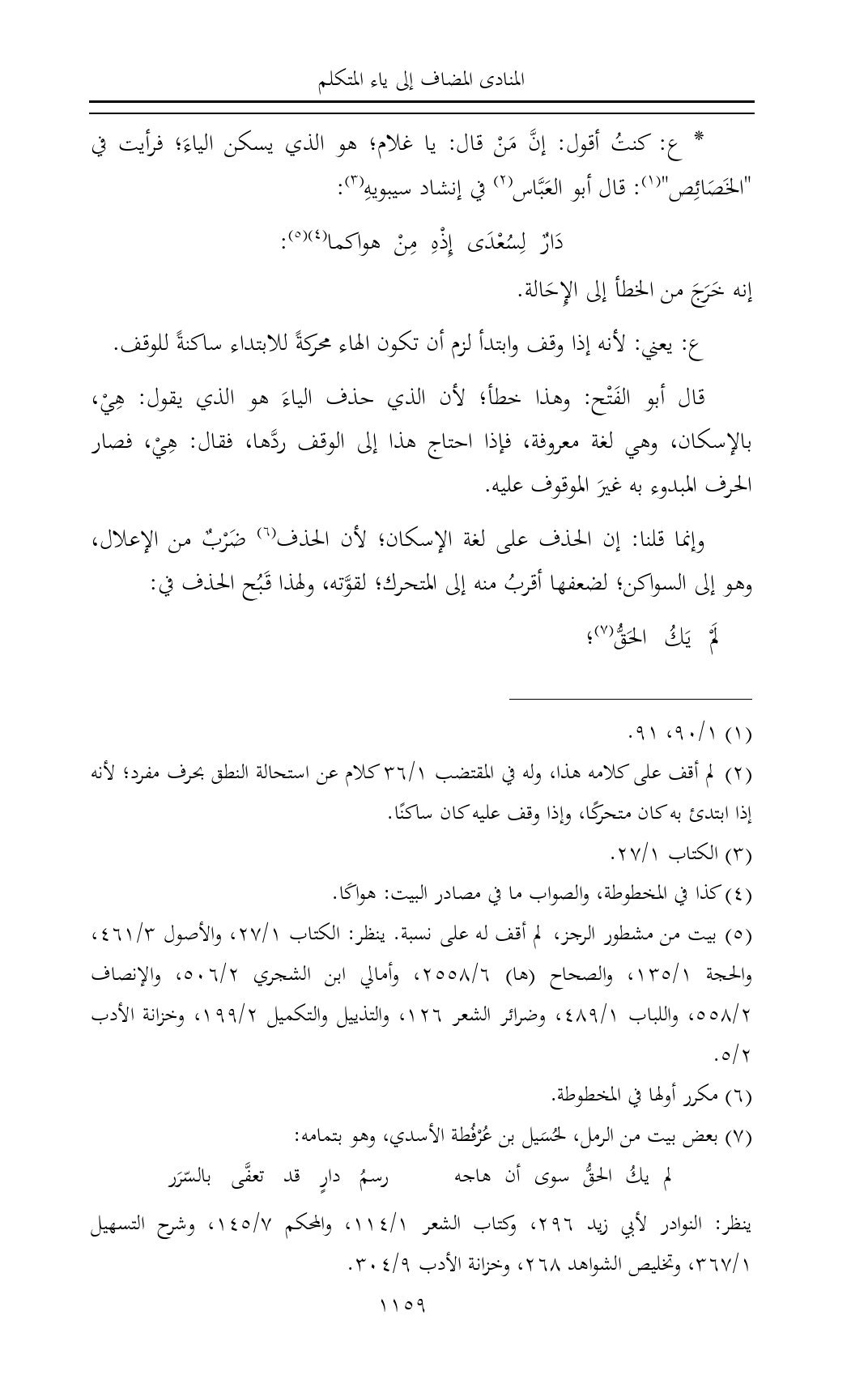 * ع: كنتُ أقول: إنَّ مَنْ قال: يا غلام؛ هو الذي يسكن الياءَ؛ فرأيت في "الخَصَائِص" (¬١): قال أبو العَبَّاس (¬٢) في إنشاد سيبويهِ (¬٣):