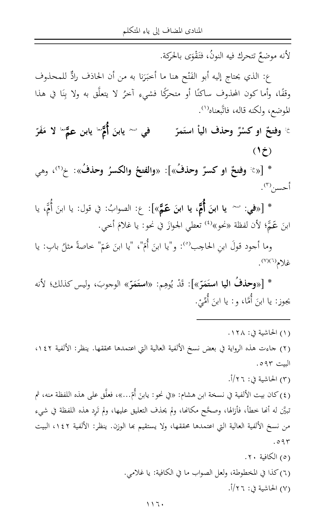 (¬٤) كان بيت الألفية في نسخة ابن هشام: «في نحو: يابنَ أُمّ ... »، فعلَّق على هذه اللفظة منه، ثم تبيَّن له أنها خطأ، فأزالها، وصحَّح مكانها، ولم يحذف التعليق عليها، ولم تَرِد هذه اللفظة في شيء من نسخ الألفية العالية التي اعتمدها محققها، ولا يستقيم بها الوزن. ينظر: الألفية ١٤٢، البيت ٥٩٣.