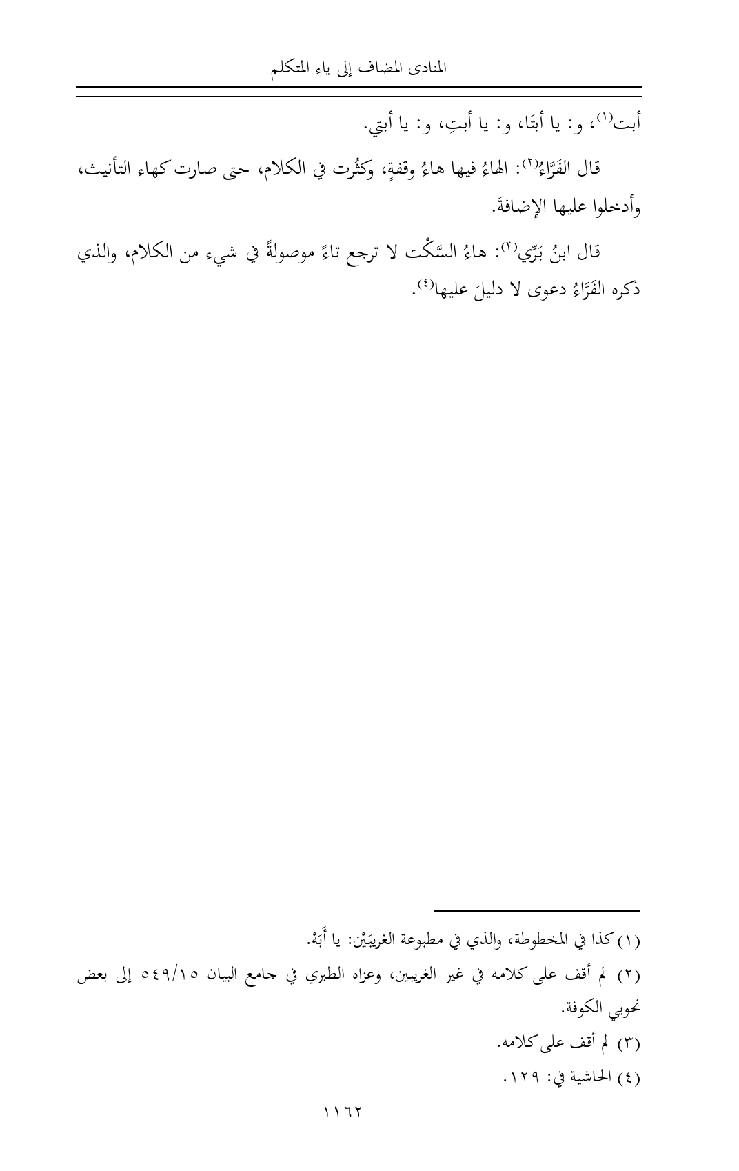 قال ابنُ بَرِّي (¬٣): هاءُ السَّكْت لا ترجع تاءً موصولةً في شيء من الكلام، والذي ذكره الفَرَّاءُ دعوى لا دليلَ عليها (¬٤).