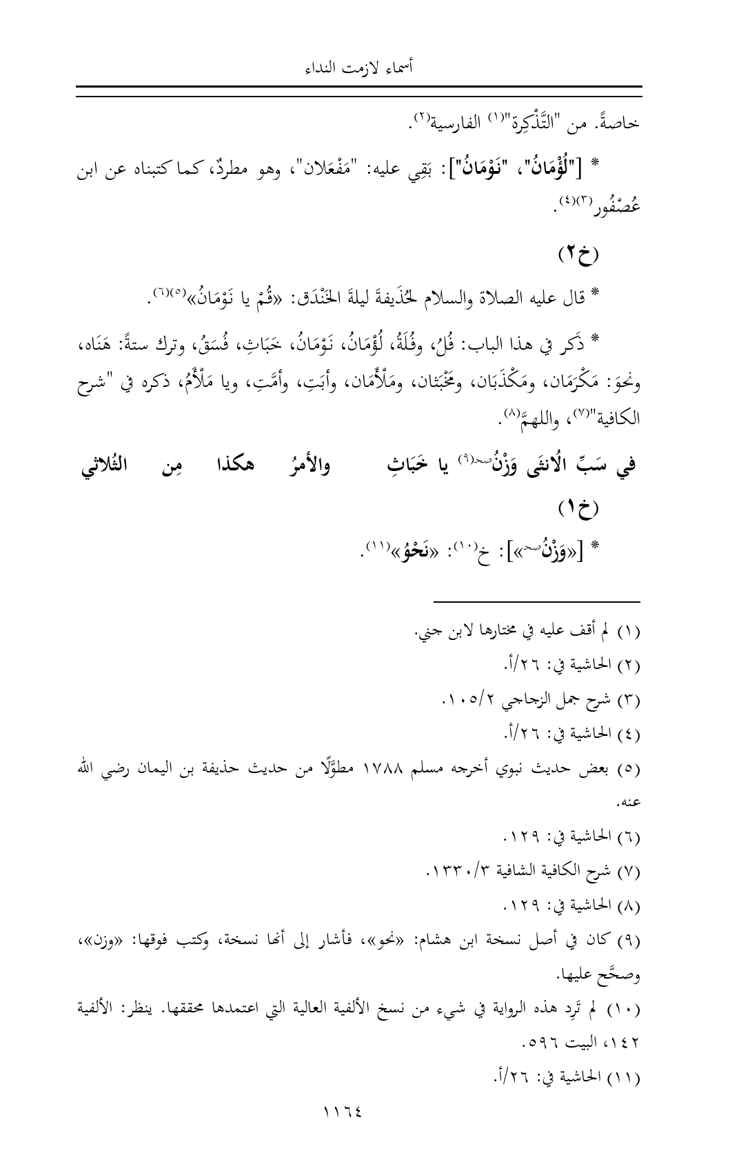* ذَكر في هذا الباب: فُلُ، وفُلَةُ، لُؤْمَانُ، نَوْمَانُ، خَبَاثِ، فُسَقُ، وترك ستةً: هَنَاه، ونحوَ: مَكْرَمَان، ومَكْذَبَان، ومَخْبَثان، ومَلْأَمَان، وأبَتِ، وأمَّتِ، ويا مَلْأَمُ، ذكره في "شرح الكافية" (¬٧)، واللهمَّ (¬٨).