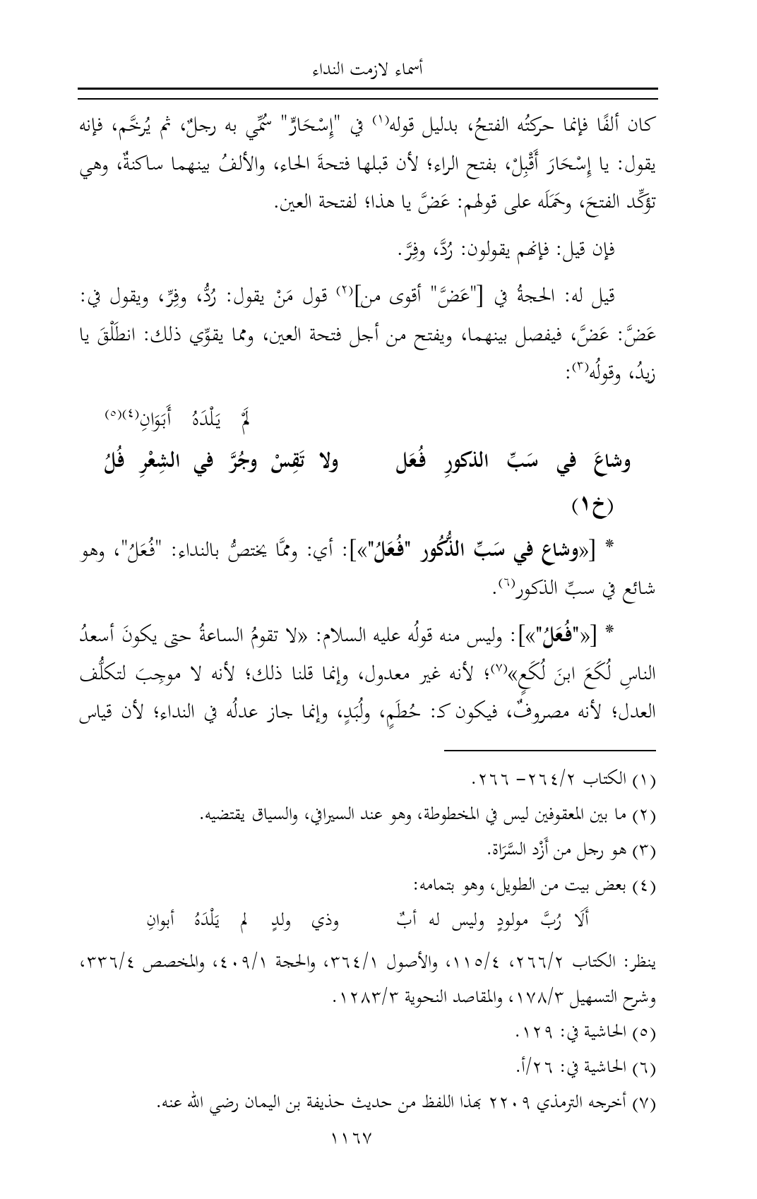 * [«وشاع في سَبِّ الذُّكُور "فُعَلُ"»]: أي: وممَّا يختصُّ بالنداء: "فُعَلُ"، وهو شائع في سبِّ الذكور (¬٦).