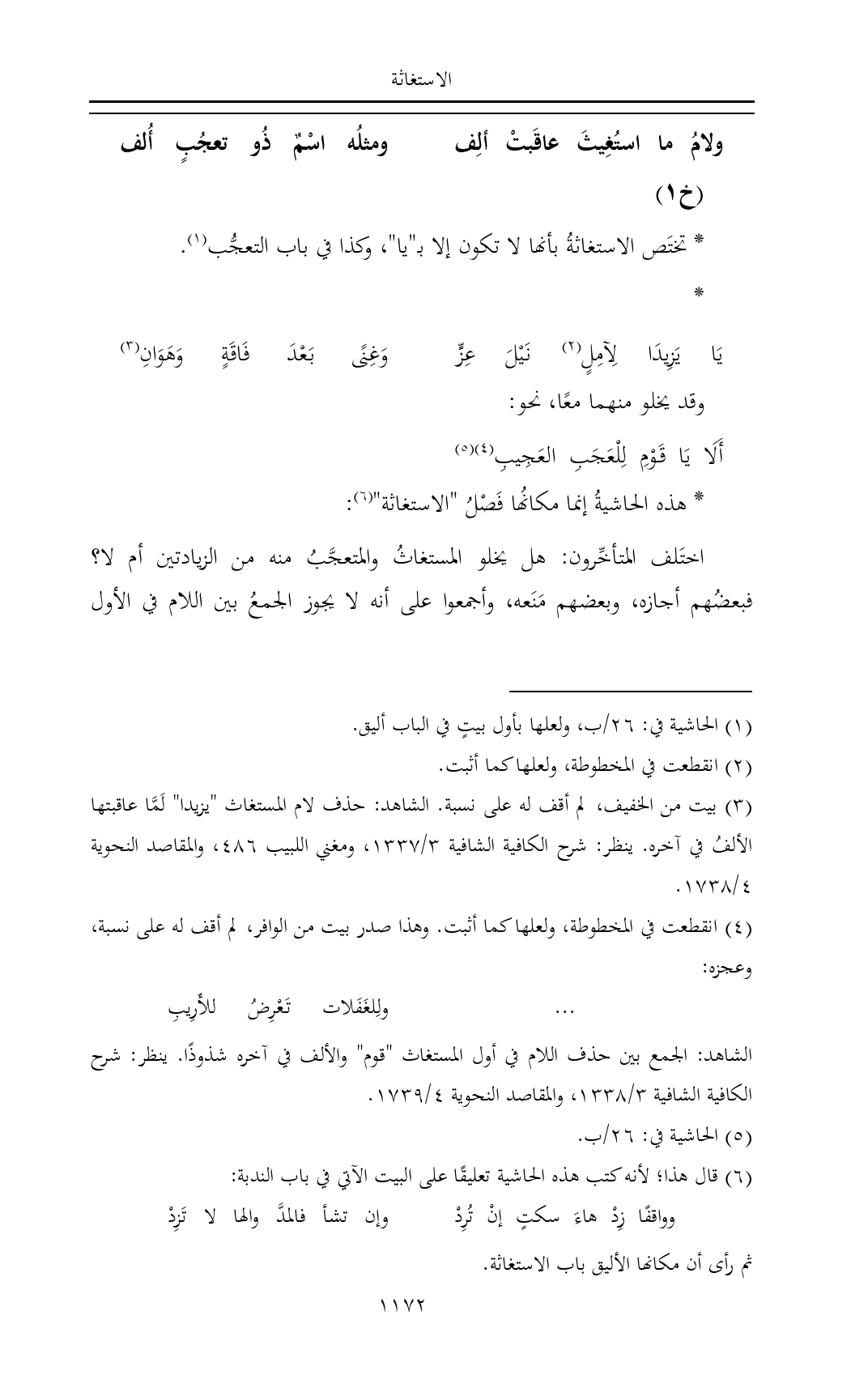 (¬٦) قال هذا؛ لأنه كتب هذه الحاشية تعليقًا على البيت الآتي في باب الندبة: