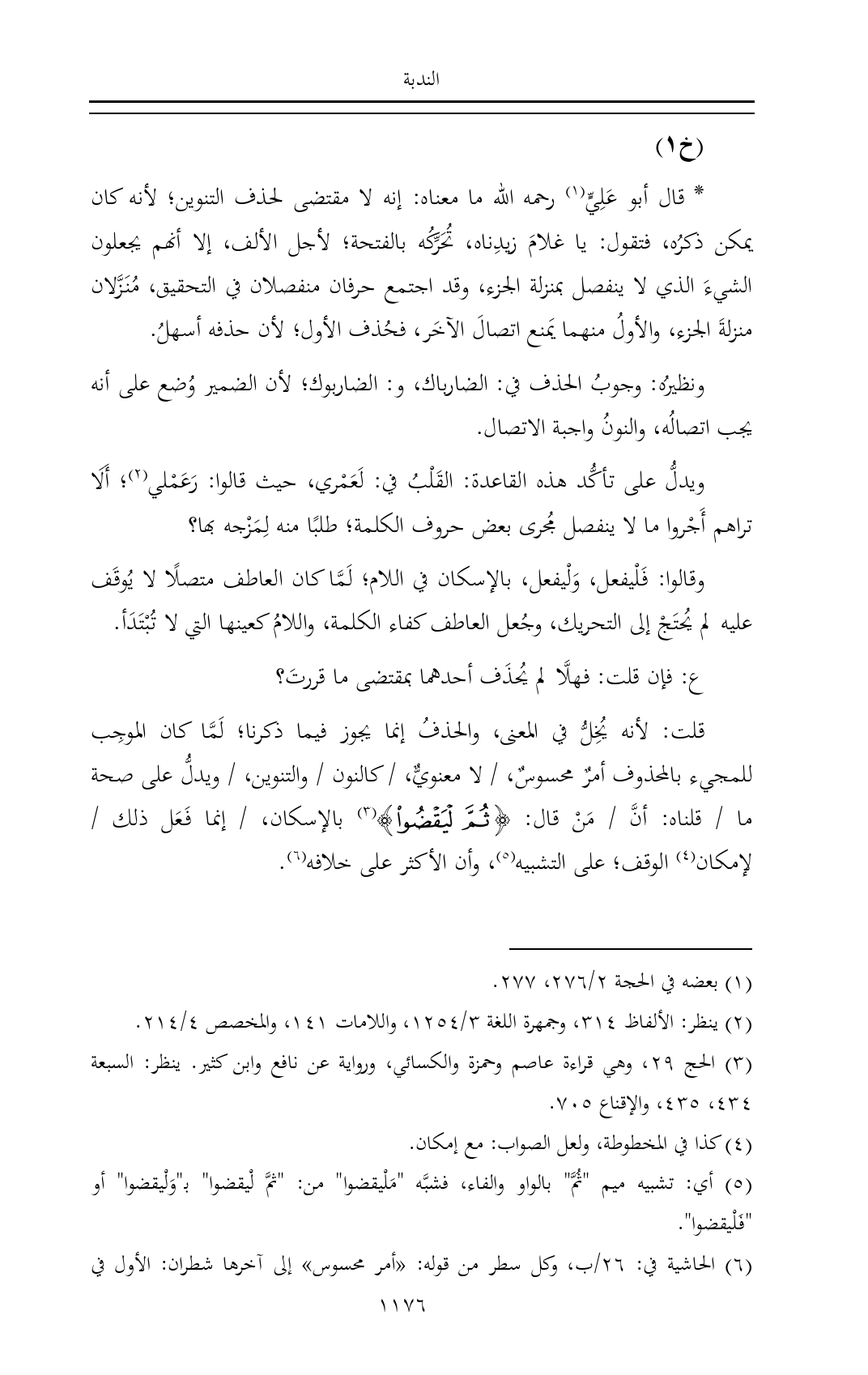 (¬٥) أي: تشبيه ميم "ثُمَّ" بالواو والفاء، فشبَّه "مَلْيقضوا" من: "ثمَّ لْيقضوا" بـ"وَلْيقضوا" أو "فَلْيقضوا".