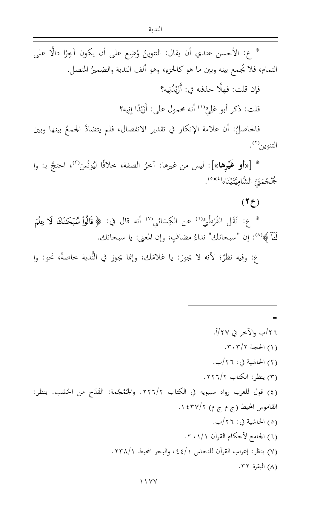 * ع: نَقَل القُرْطُبيُّ (¬٦) عن الكِسَائي (¬٧) أنه قال في: {قَالُوا سُبْحَانَكَ لَا عِلْمَ لَنَا} (¬٨): إن "سبحانك" نداءُ مضافٍ، وإن المعنى: يا سبحانك.