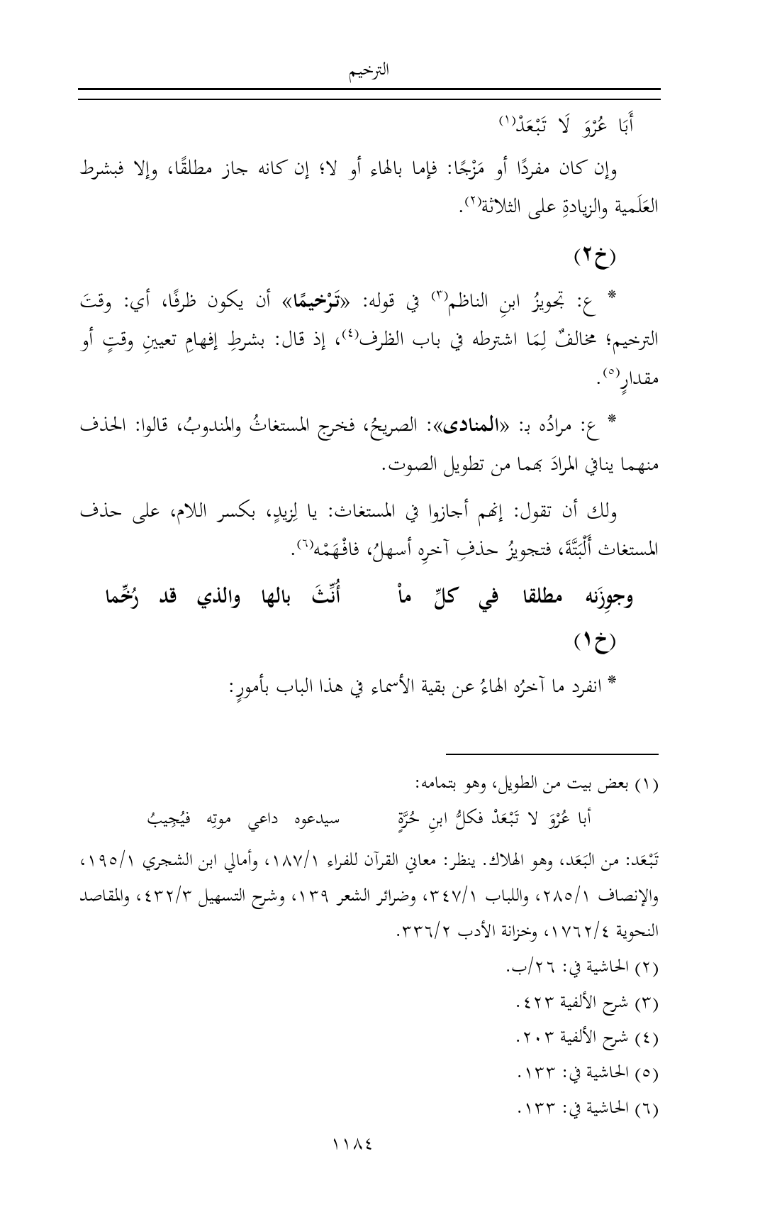 * ع: تجويزُ ابنِ الناظم (¬٣) في قوله: «تَرْخيمًا» أن يكون ظرفًا، أي: وقتَ الترخيم؛ مخالفٌ لِمَا اشترطه في باب الظرف (¬٤)، إذ قال: بشرطِ إفهامِ تعيينِ وقتٍ أو مقدارٍ (¬٥).