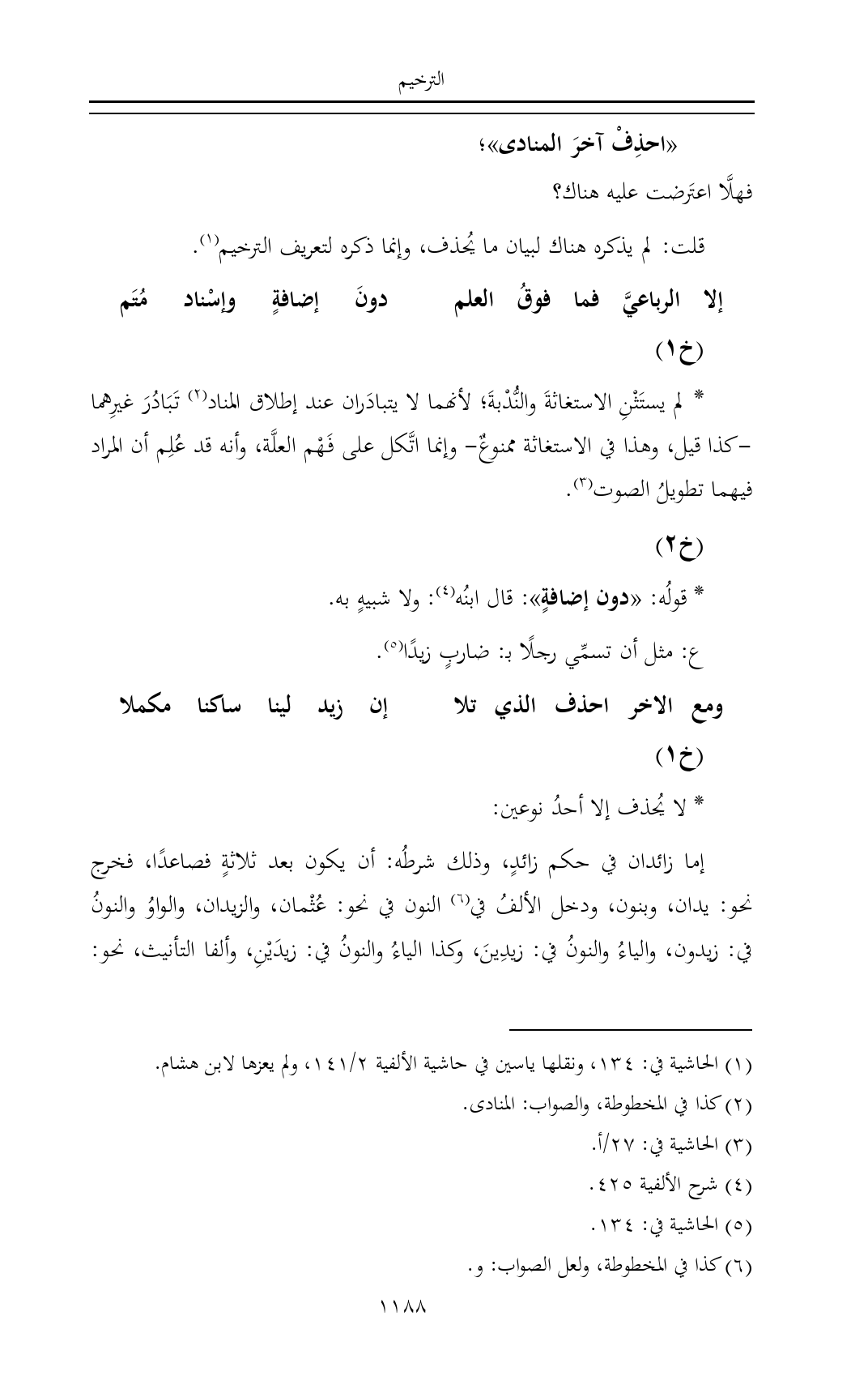 قلت: لم يذكره هناك لبيان ما يُحذف، وإنما ذكره لتعريف الترخيم (¬١).