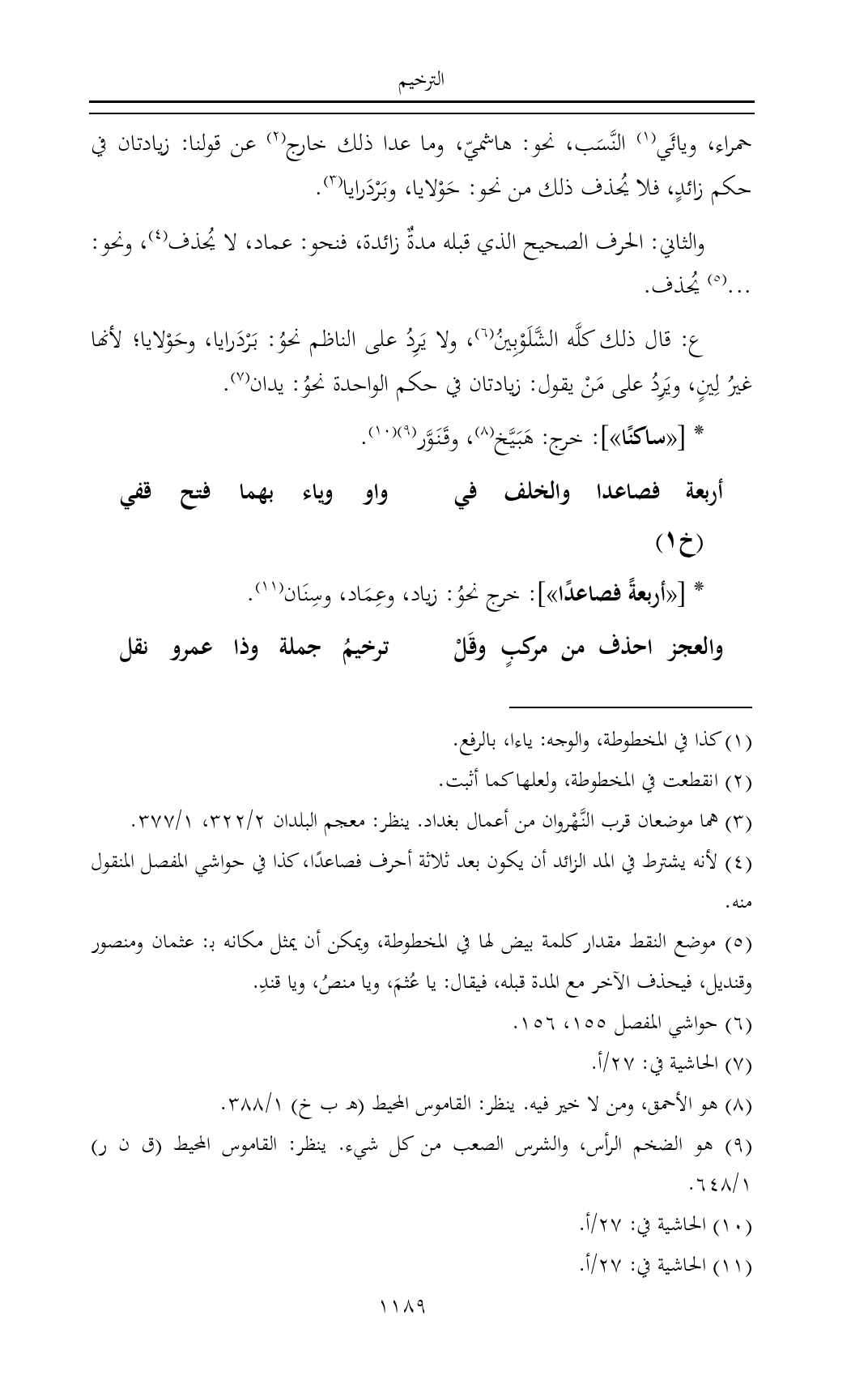 (¬٥) موضع النقط مقدار كلمة بيض لها في المخطوطة، ويمكن أن يمثل مكانه بـ: عثمان ومنصور وقنديل، فيحذف الآخر مع المدة قبله، فيقال: يا عُثمَ، ويا منصُ، ويا قندِ.