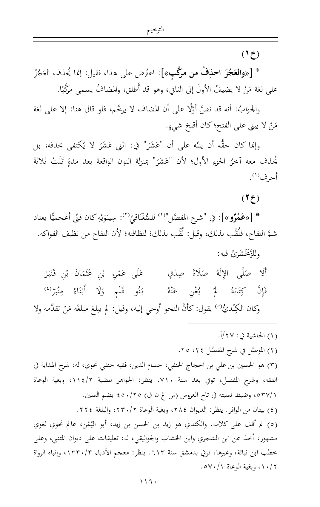 (¬٣) هو الحسين بن علي بن الحجاج الحنفي، حسام الدين، فقيه حنفي نحوي، له: شرح الهداية في الفقه، وشرح المفصل، توفي بعد سنة ٧١٠. ينظر: الجواهر المضية ٢/ ١١٤، وبغية الوعاة ١/ ٥٣٧، وضبط نسبته في تاج العروس (س غ ن ق) ٢٥/ ٤٥٠ بضم السين.