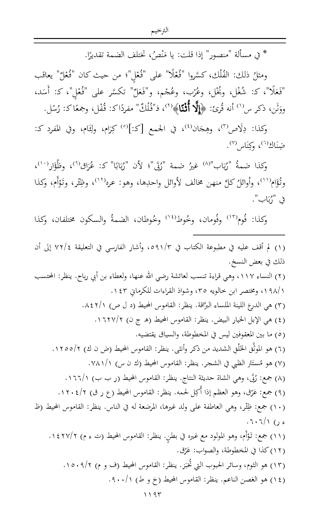 وكذا ضمةُ "رُبَاب" (¬٨) غيرُ ضمة "رُبَّى"؛ لأن "رُبَابًا" كـ: عُرَاق (¬٩)، وظُؤَار (¬١٠)، وتُؤَام (¬١١)، وأوائلُ كلٍّ منهن مخالف لأوائل واحدِها، وهو: عره (¬١٢)، وظِئْر، وتَوْأَم، وكذا في "رُبَاب".