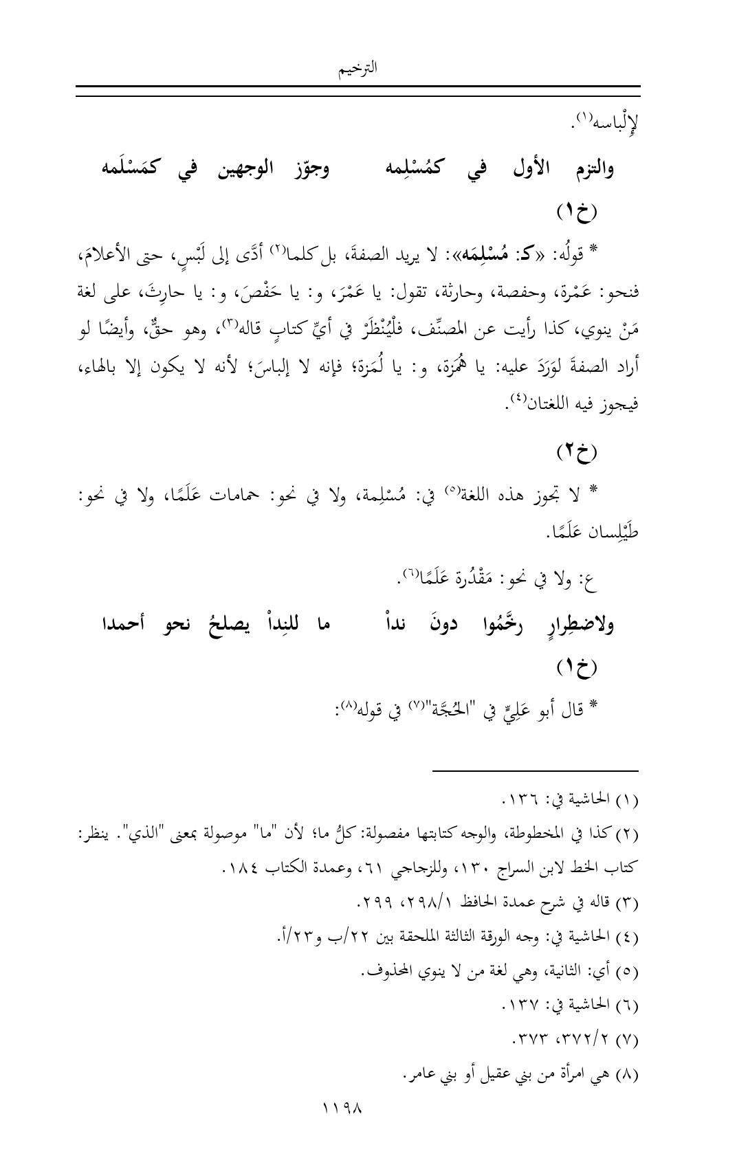 * لا تجوز هذه اللغة (¬٥) في: مُسْلِمة، ولا في نحو: حمامات عَلَمًا، ولا في نحو: طَيْلِسان عَلَمًا.