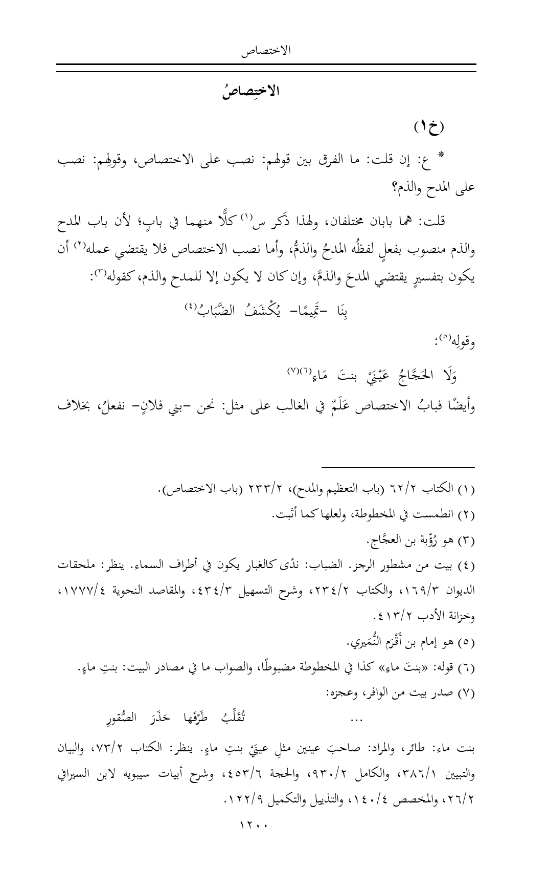 قلت: هما بابان مختلفان، ولهذا ذَكر س (¬١) كلًّا منهما في بابٍ؛ لأن باب المدح والذم منصوب بفعلٍ لفظُه المدحُ والذمُّ، وأما نصب الاختصاص فلا يقتضي عمله (¬٢) أن يكون بتفسيرٍ يقتضي المدحَ والذمَّ، وإن كان لا يكون إلا للمدح والذم، كقوله (¬٣):