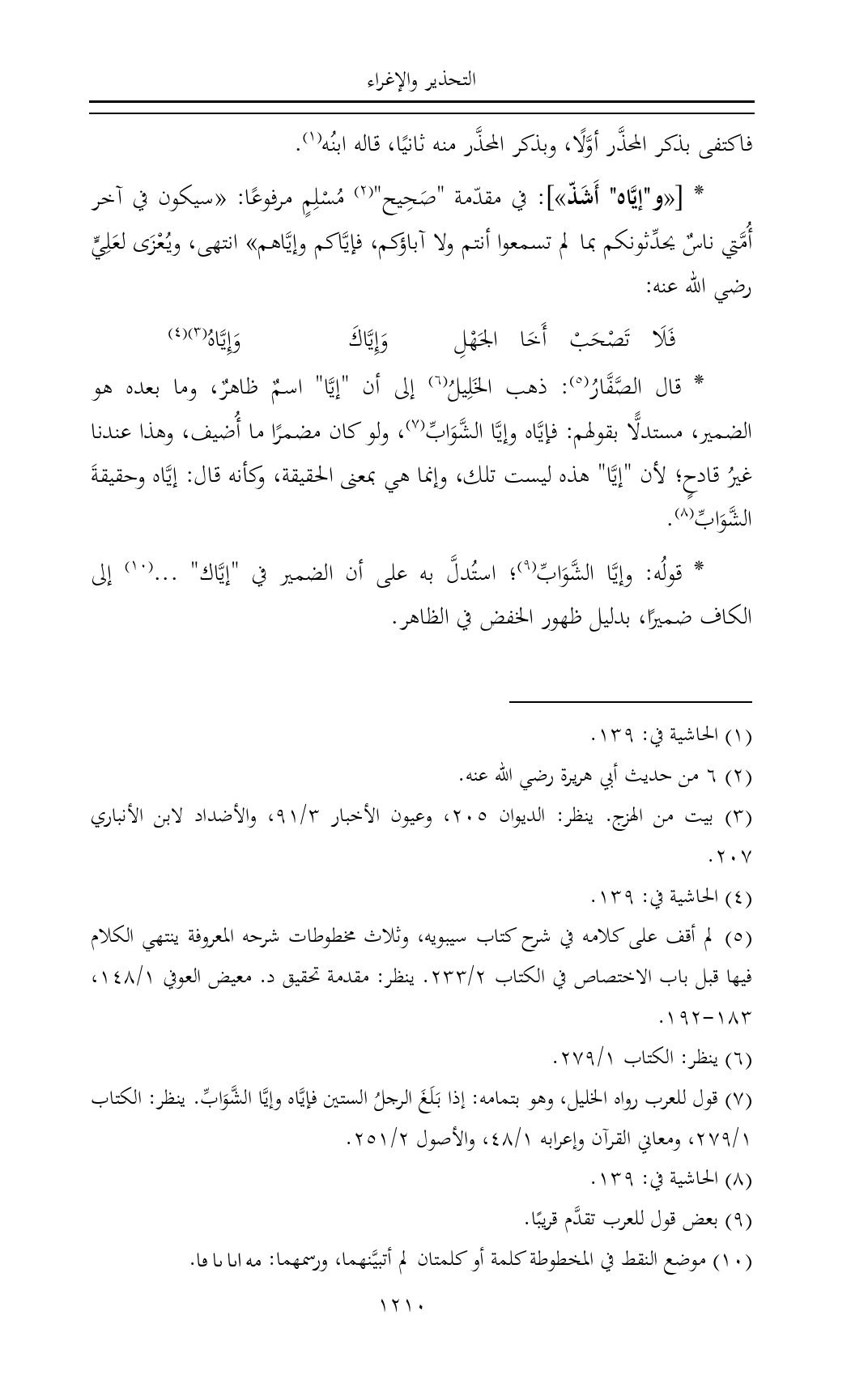 * [«و"إيَّاه" أَشَذّ»]: في مقدّمة "صَحِيح" (¬٢) مُسْلِمٍ مرفوعًا: «سيكون في آخر أُمَّتي ناسٌ يحدِّثونكم بما لم تسمعوا أنتم ولا آباؤكم، فإيَّاكم وإيَّاهم» انتهى، ويُعْزَى لعَلِيٍّ رضي الله عنه: