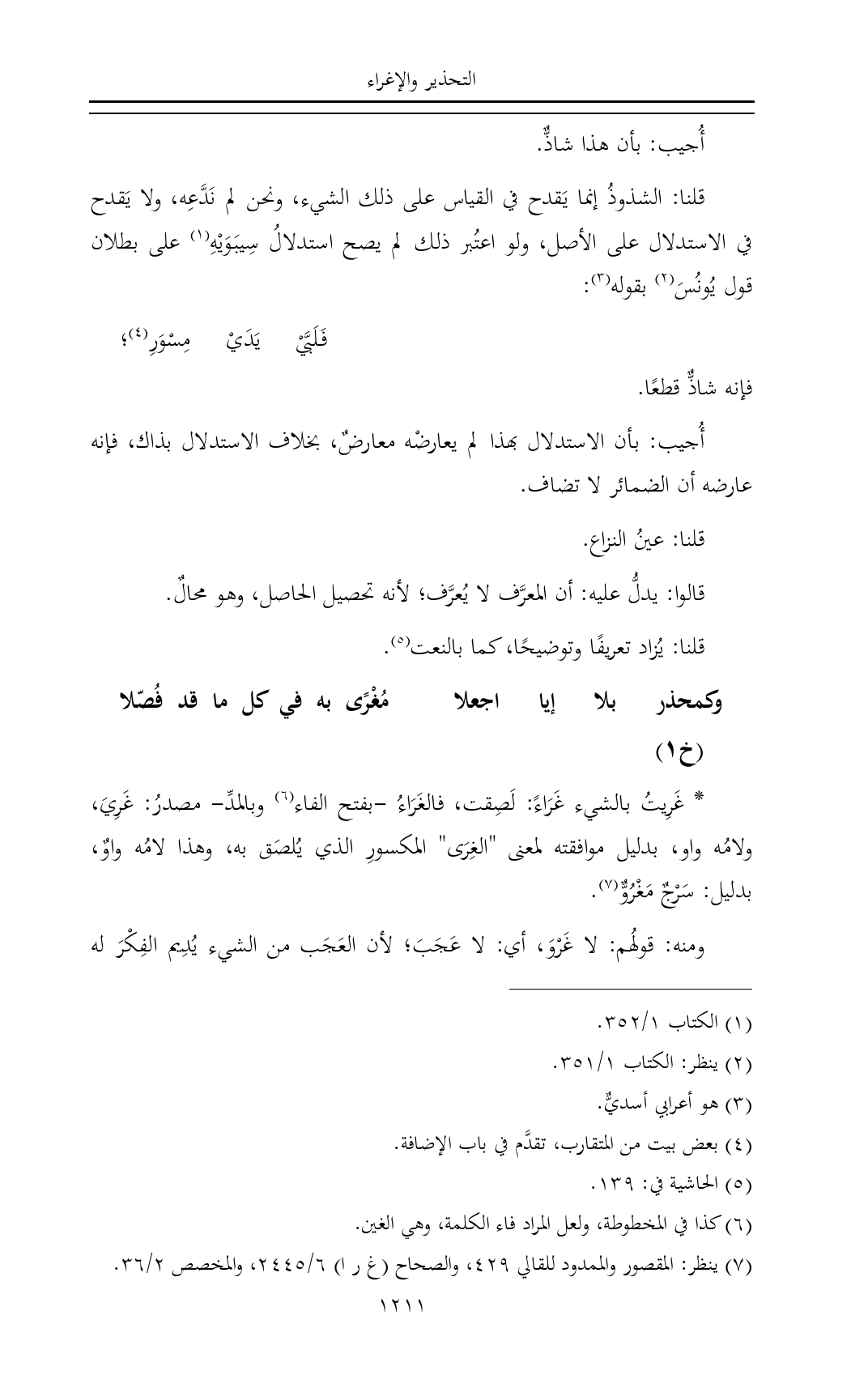 قلنا: الشذوذُ إنما يَقدح في القياس على ذلك الشيء، ونحن لم نَدَّعِه، ولا يَقدح في الاستدلال على الأصل، ولو اعتُبر ذلك لم يصح استدلالُ سِيبَوَيْهِ (¬١) على بطلان قول يُونُسَ (¬٢) بقوله (¬٣):