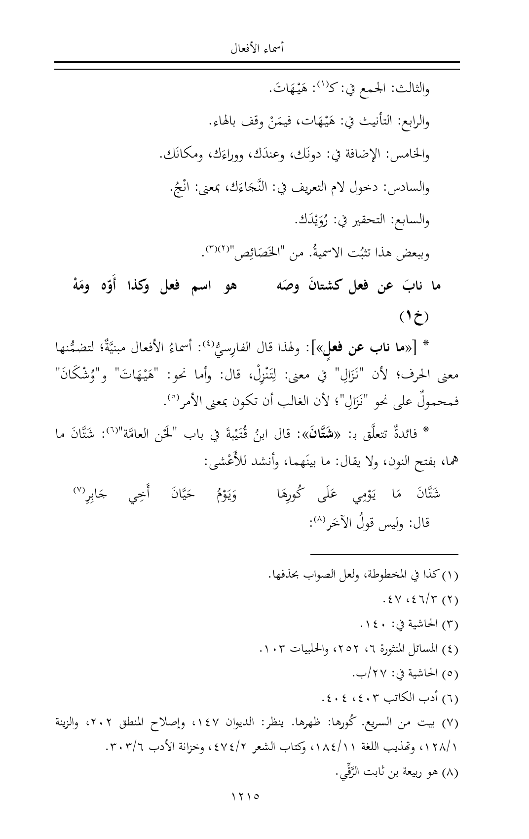 * [«ما ناب عن فعلٍ»]: ولهذا قال الفارِسيُّ (¬٤): أسماءُ الأفعال مبنيَّةٌ؛ لتضمُّنها معنى الحرف؛ لأن "نَزَالِ" في معنى: لِتَنْزِلْ، قال: وأما نحو: "هَيْهَاتَ" و"وُشْكَانَ" فمحمولٌ على نحو "نَزَالِ"؛ لأن الغالب أن تكون بمعنى الأمر (¬٥).