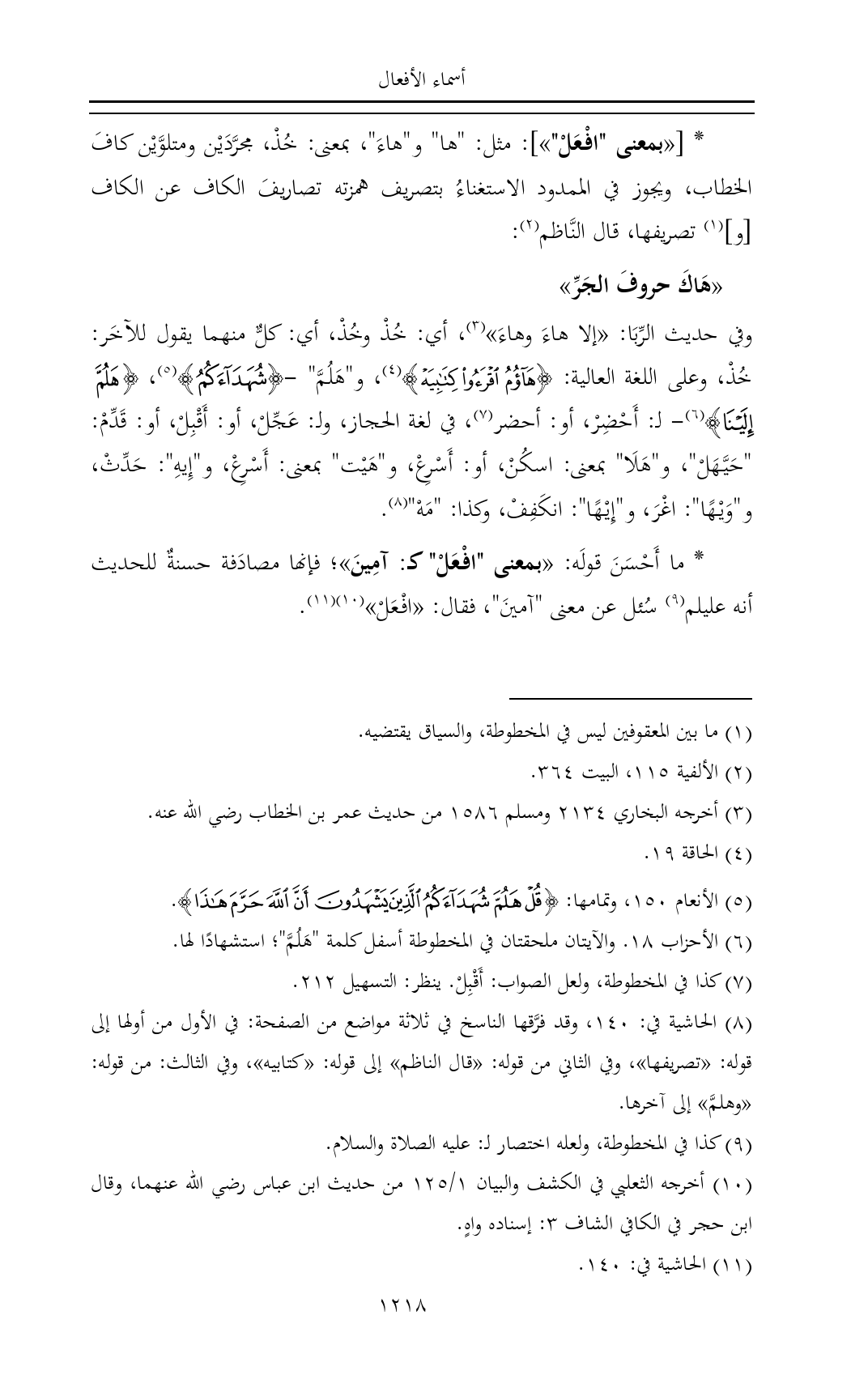 وفي حديث الرِّبَا: «إلا هاءَ وهاءَ» (¬٣)، أي: خُذْ وخُذْ، أي: كلٌّ منهما يقول للآخَر: خُذْ، وعلى اللغة العالية: {هَاؤُمُ اقْرَءُوا كِتَابِيَهْ} (¬٤)، و"هَلُمَّ" - {شُهَدَاءَكُمُ} (¬٥)، {هَلُمَّ إِلَيْنَا} (¬٦) - لـ: أَحْضِرْ، أو: أحضر (¬٧)، في لغة الحجاز، ولـ: عَجِّلْ، أو: أَقْبِلْ، أو: قَدِّمْ: "حَيَّهَلْ"، و"هَلَا" بمعنى: اسكُنْ، أو: أَسْرِعْ، و"هَيْت" بمعنى: أَسْرِعْ، و"إِيهِ": حَدِّثْ، و"وَيْهًا": اغْرَ، و"إِيْهًا": انكَفِفْ، وكذا: "مَهْ" (¬٨).