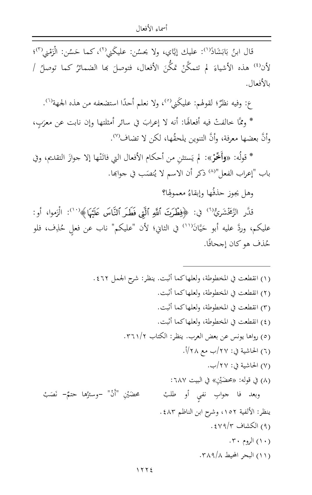ع: وفيه نظرٌ؛ لقولهم: عليكَني (¬٥)، ولا نعلم أحدًا استضعفه من هذه الجهة (¬٦).